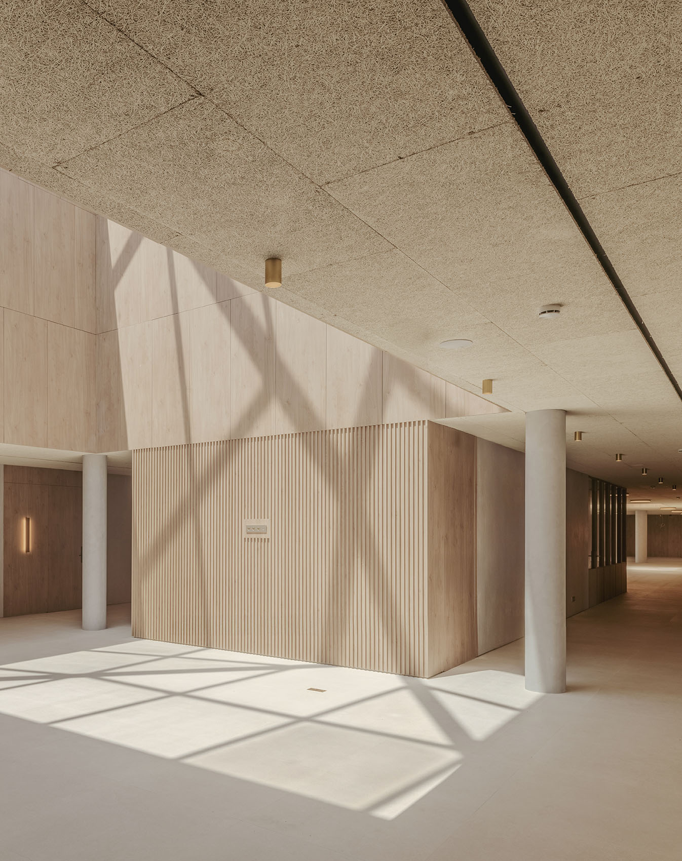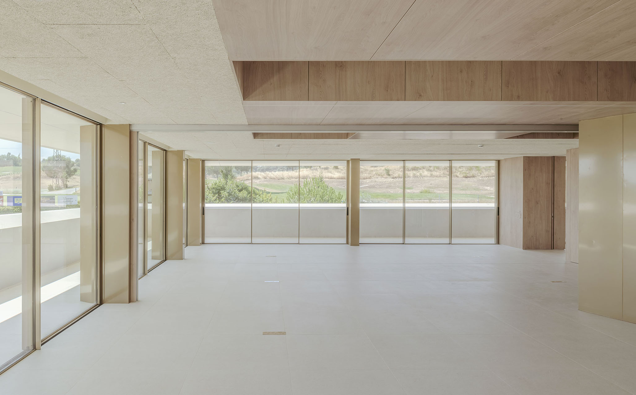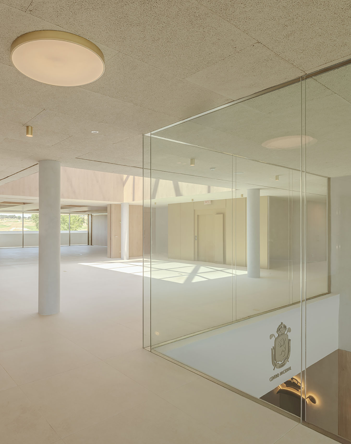 El edificio se articula en torno a dos ejes principales. El eje norte–sur se abre al paisaje mediante terrazas cubiertas, mientras que el eje este–oeste ordena un gradiente de privacidad que comienza en una pasarela peatonal, punto de conexión entre el interior y el green del hoyo nueve. Desde ese umbral entre lo público y lo íntimo emergen dos salas de reuniones que mantienen una relación franca y directa con el campo. Espacios versátiles, capaces de adaptarse a múltiples usos y escalas, que revelan la flexibilidad inherente al edificio.