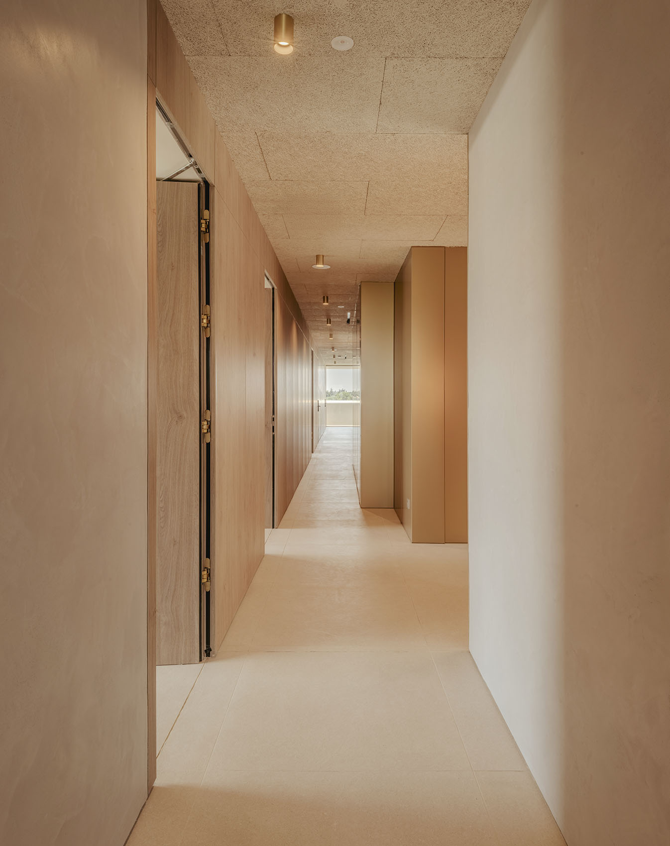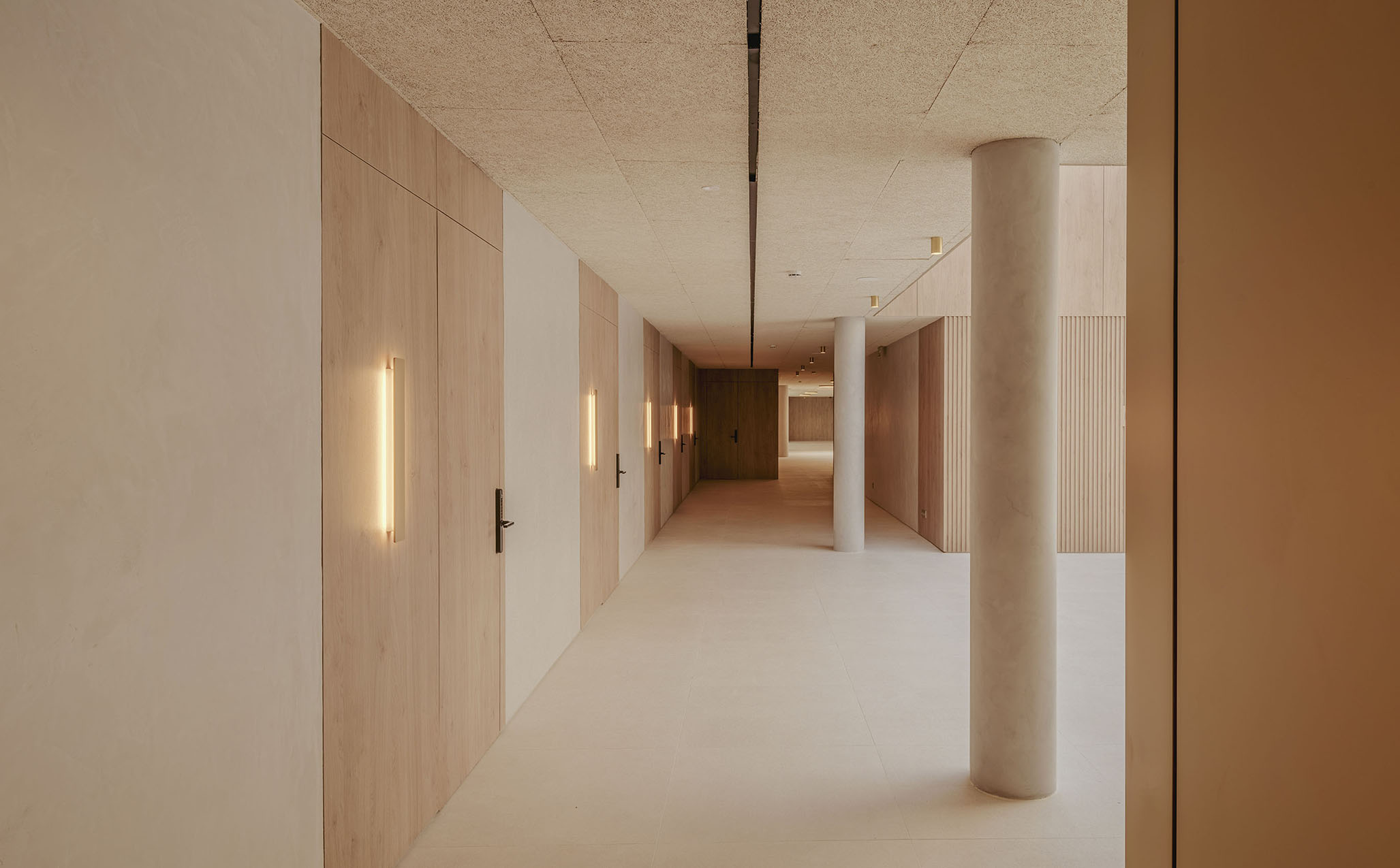 Desde esta zona común nace el acceso a la residencia de corta estancia, donde un amplio espacio de acogida configura el corazón del proyecto. La terraza cubierta —pensada como un diálogo pausado entre interior y exterior— articula la relación con el restaurante en planta baja y con el hoyo 18, reforzando la continuidad visual y funcional con el paisaje. A partir del carácter dual de esta terraza, el programa de habitaciones se despliega en el ala oeste mediante dos volúmenes longitudinales que completan y dan sentido al perímetro habitado.