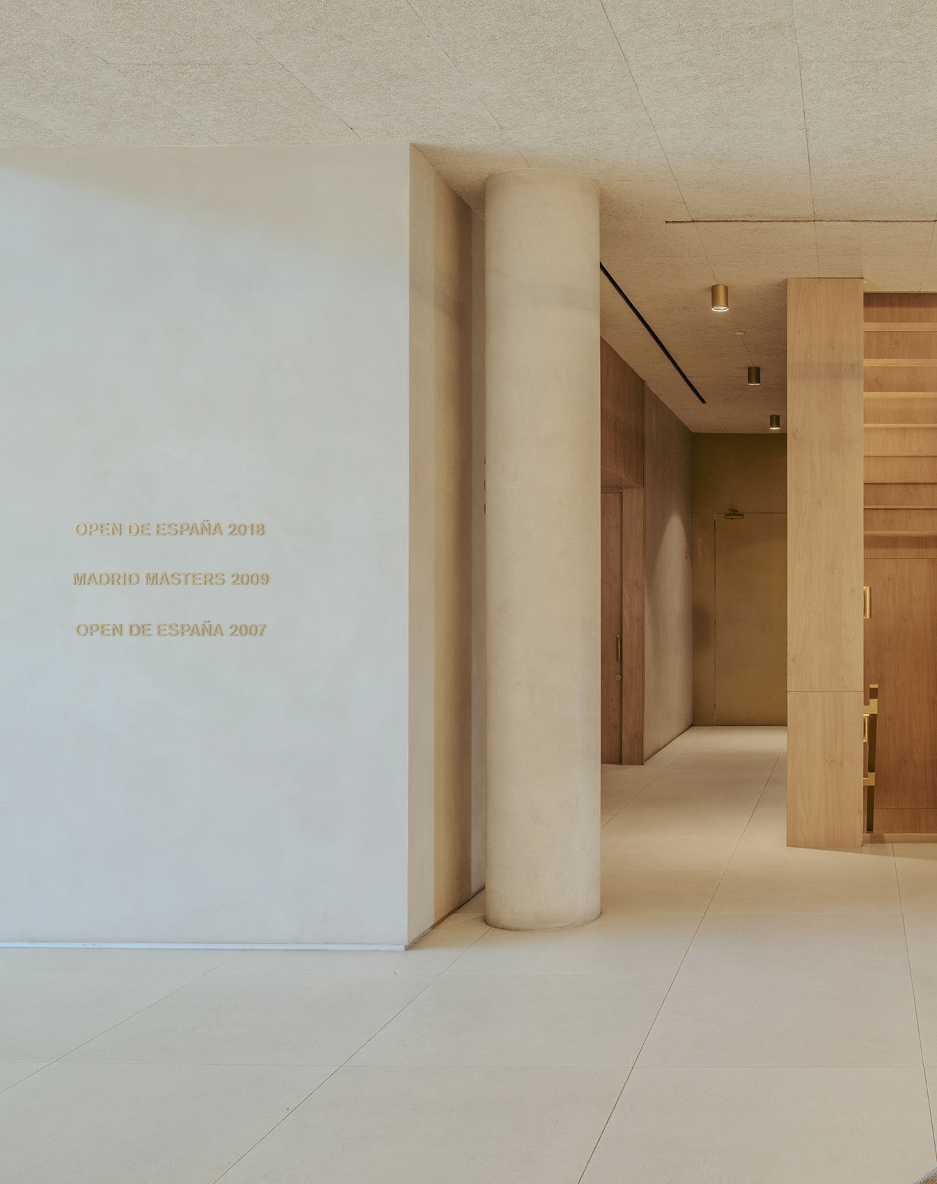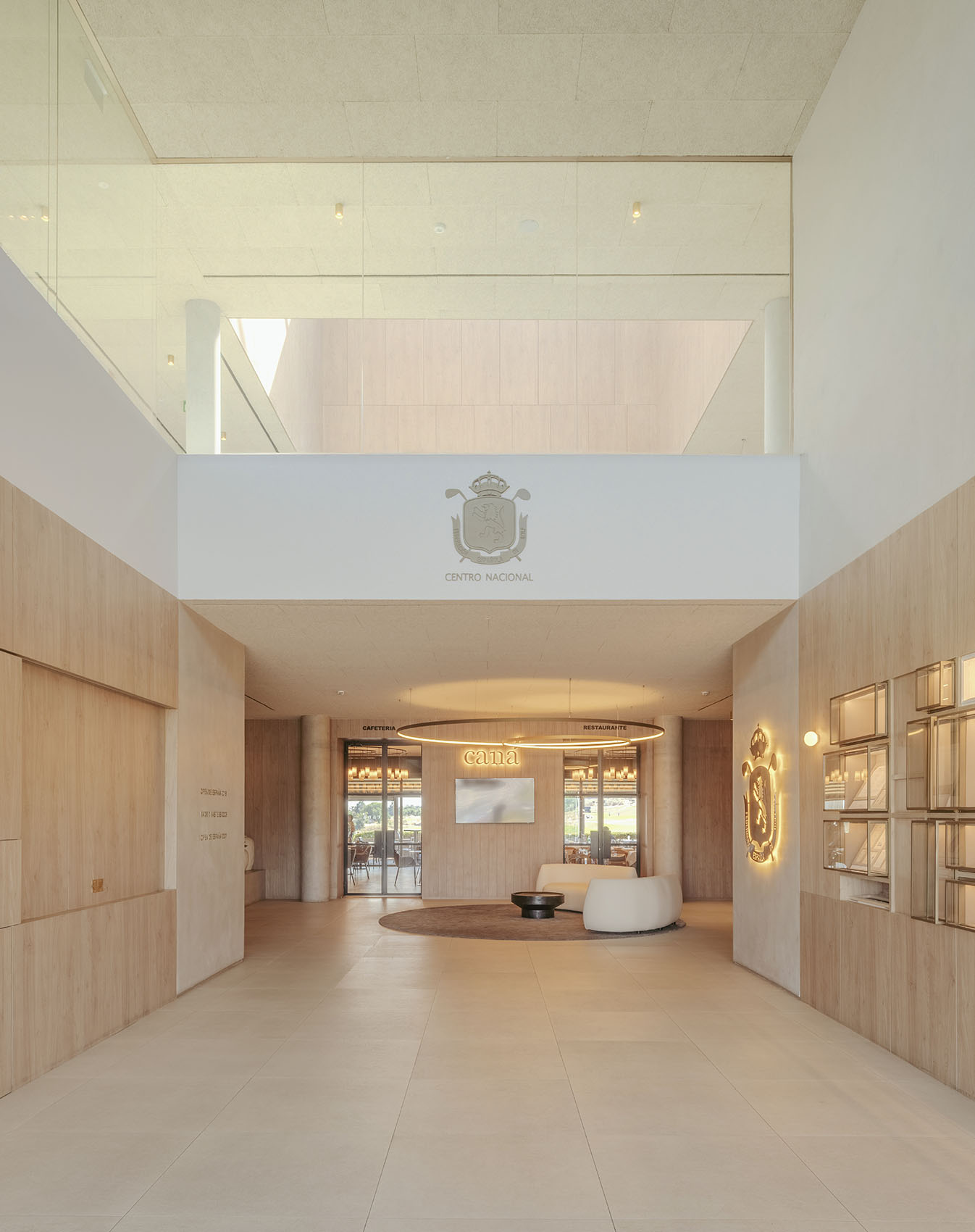 El vestíbulo de entrada del Centro Nacional de Golf se concibe como un umbral donde la estrategia proyectual ensayada previamente en el proyecto para su residencia de corta estancia, se vuelve tangible a escala real.