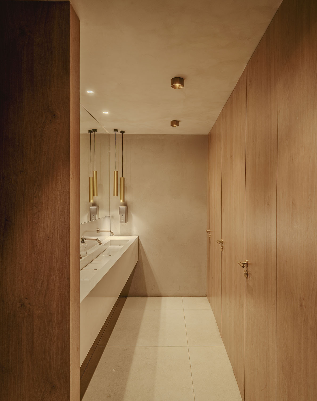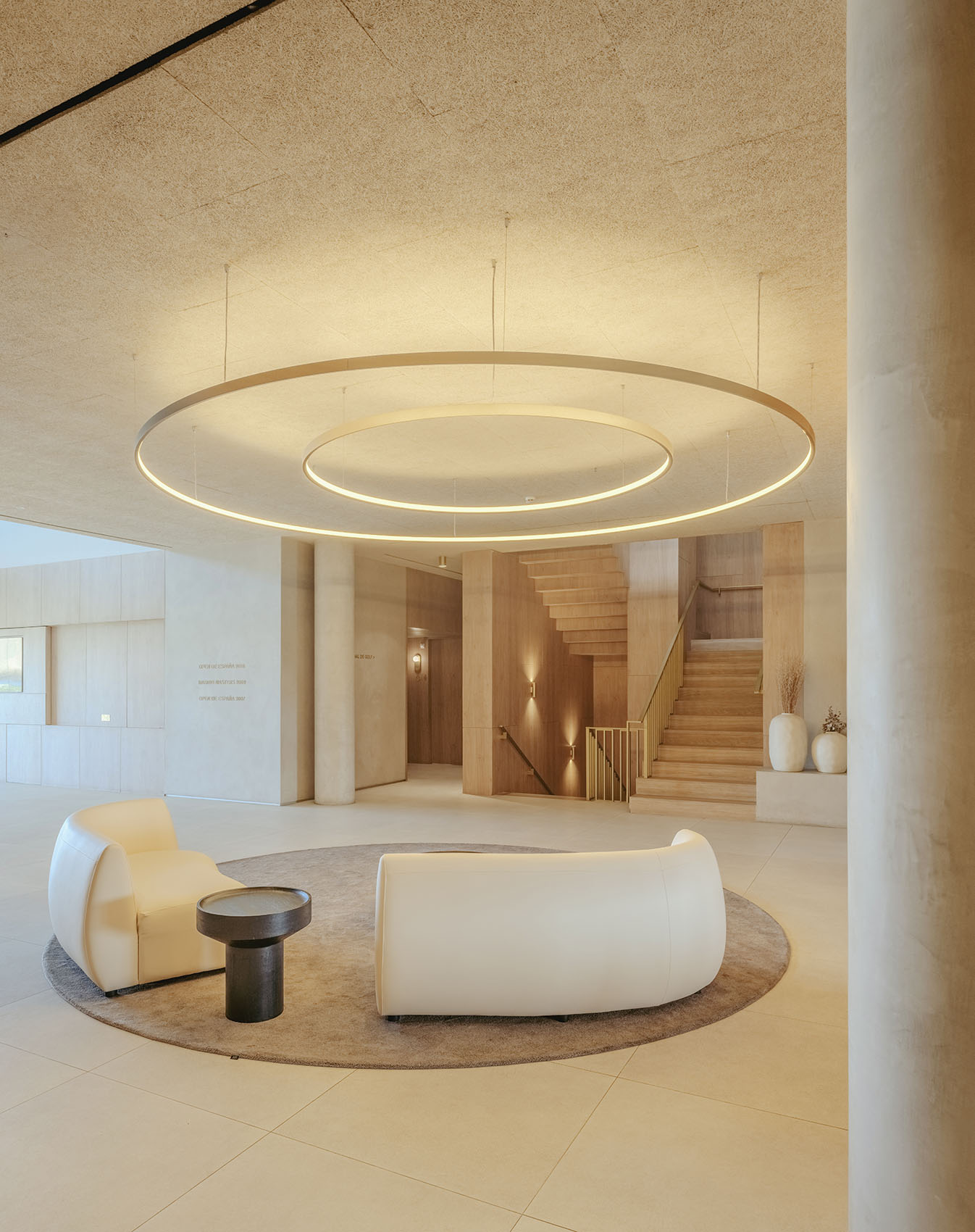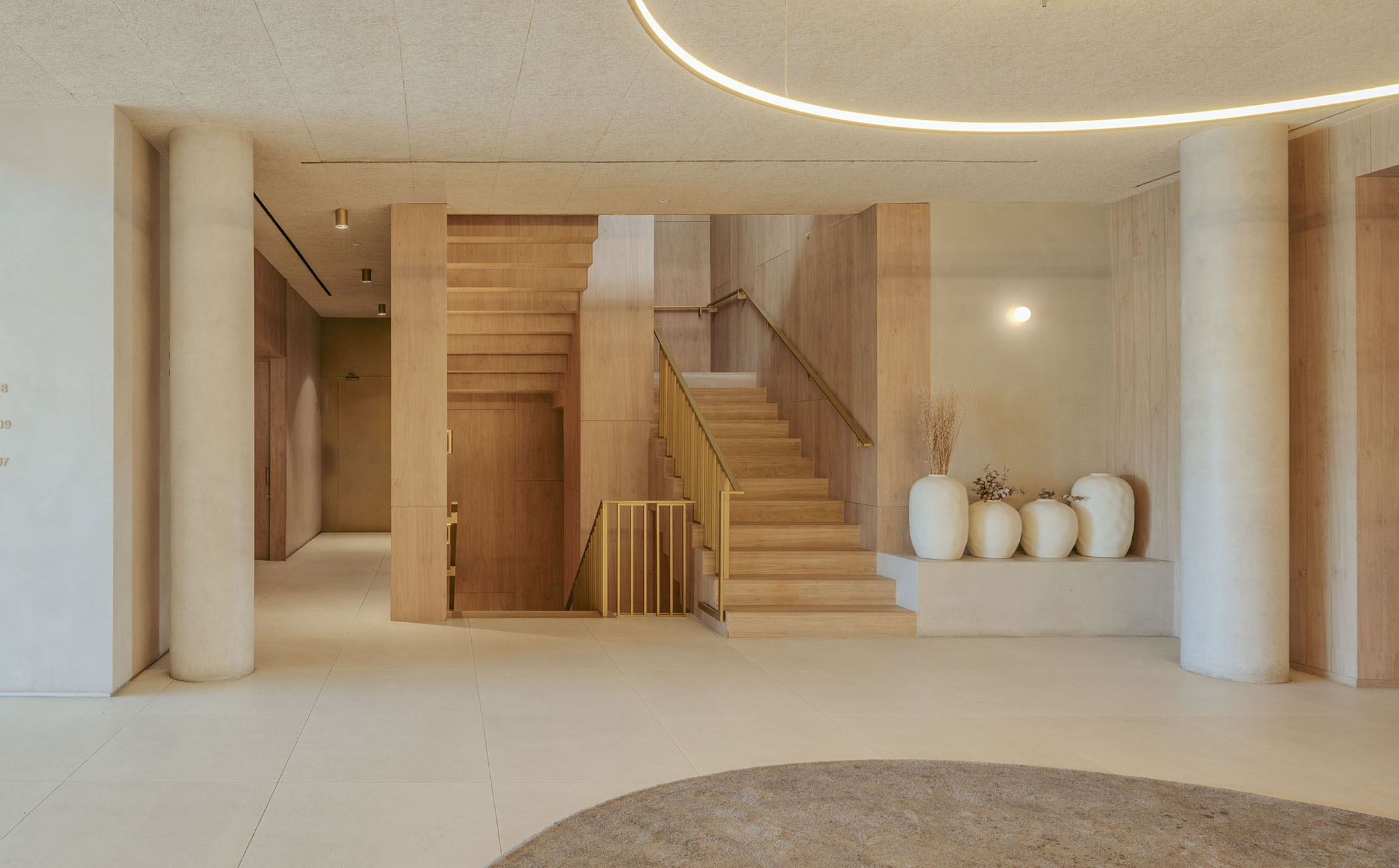 La madera, el mortero de cal, la chapa de bronce y la piedra caliza forman una paleta que actúa como hilo conductor. No sólo define la identidad del espacio de bienvenida: también anticipa el diálogo vertical con la planta superior, como una promesa material que se despliega a medida que se recorre el edificio.