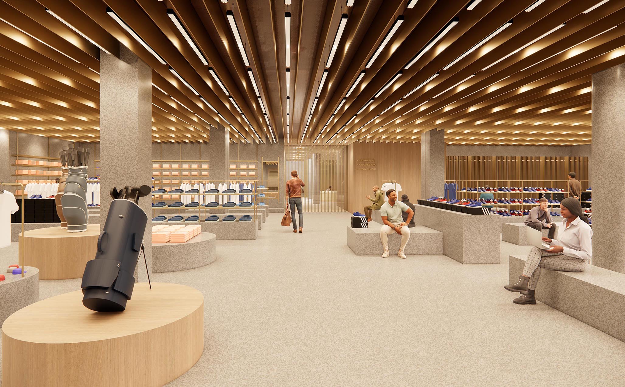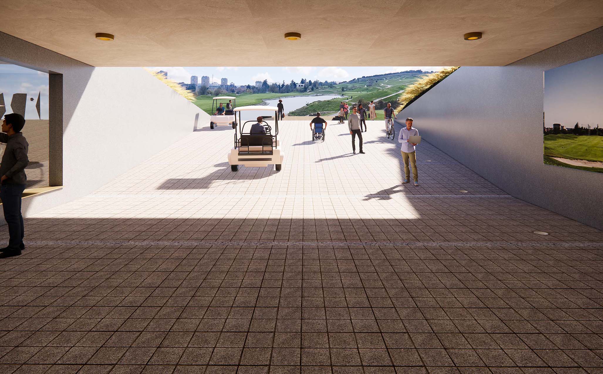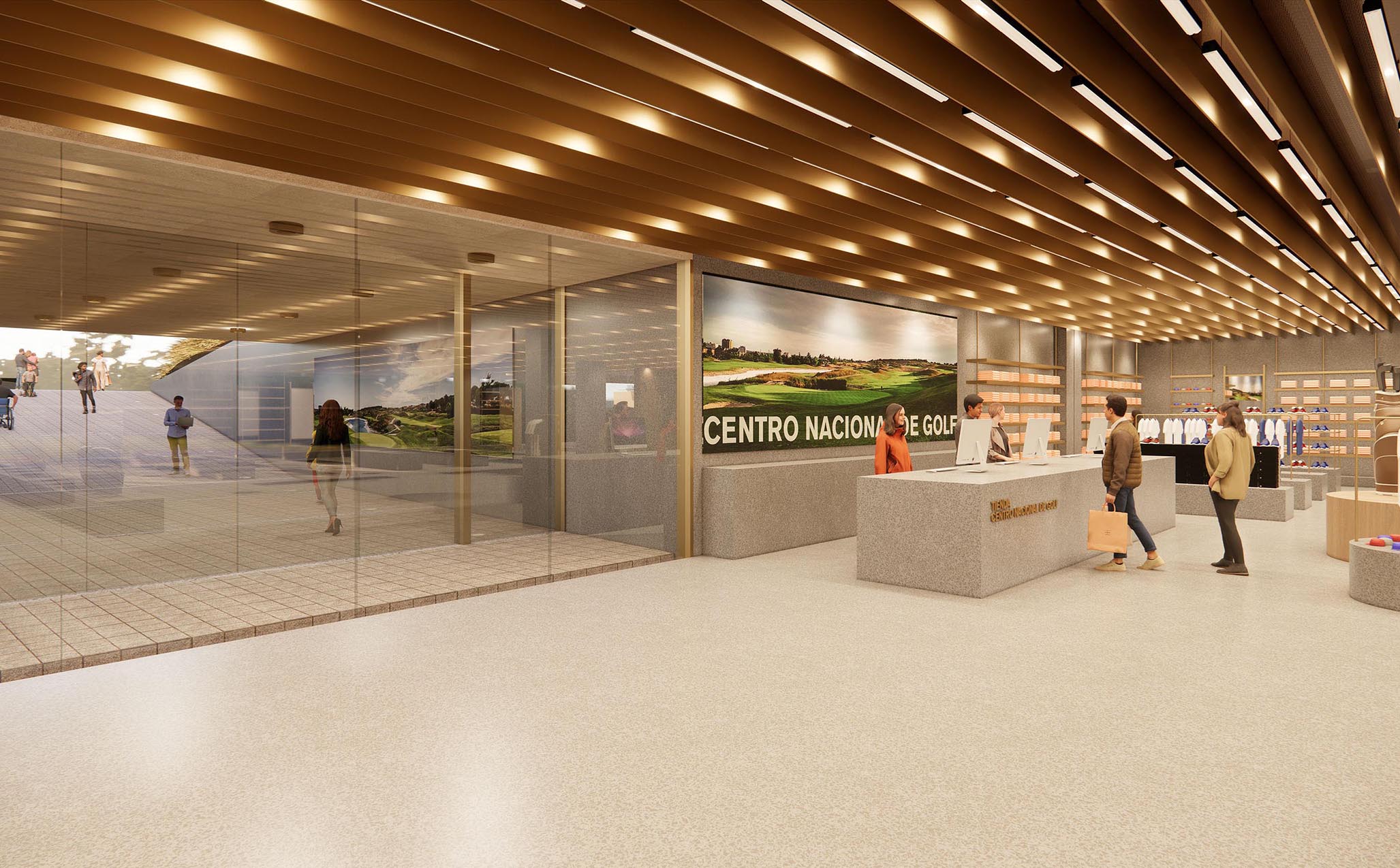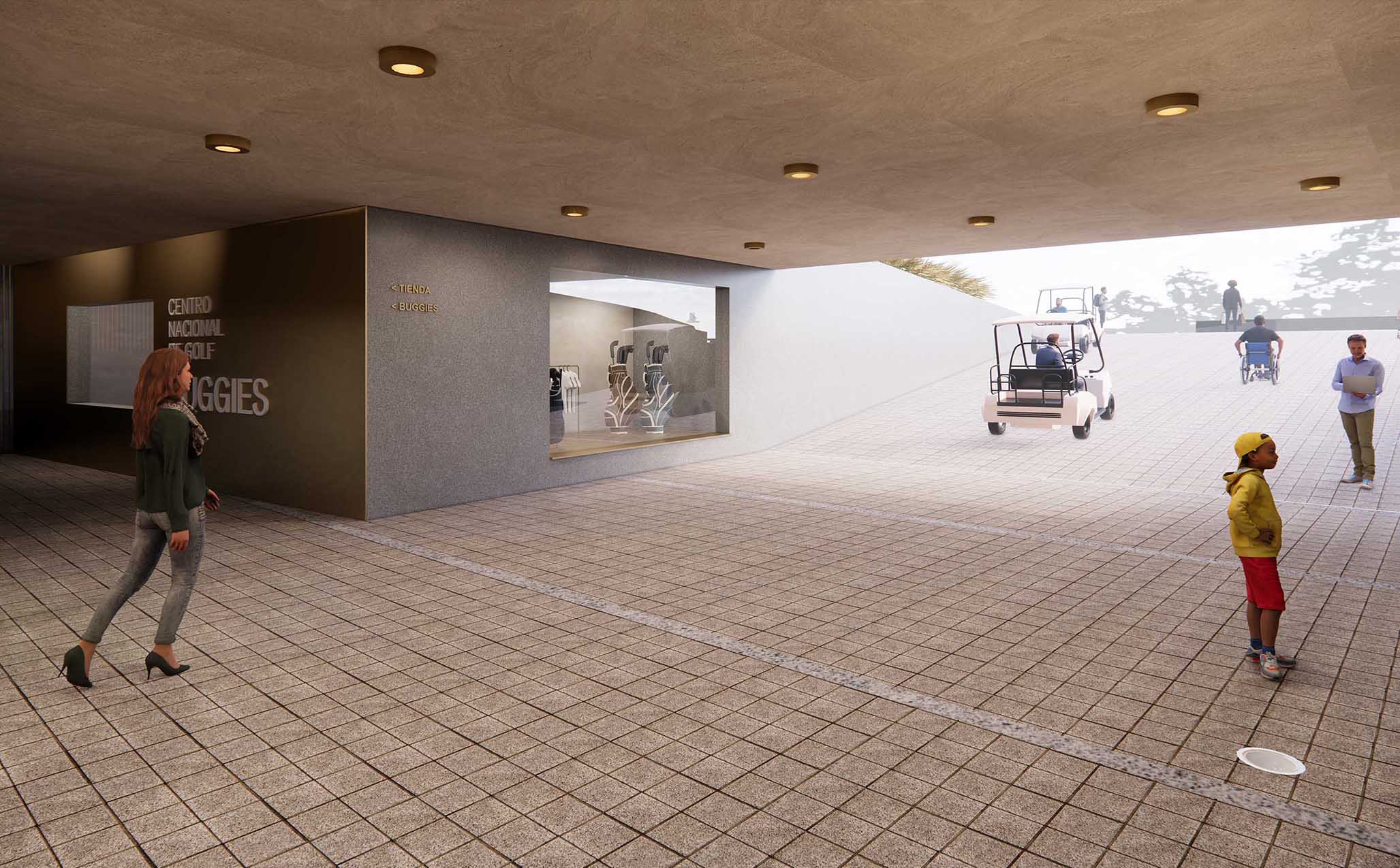 Esta operación permite que, desde el aparcamiento, el visitante pueda atravesar el edificio y salir directamente al hoyo 18, activando así una planta sótano hasta ahora infrautilizada. A partir de esta nueva circulación, se construye en el corazón del edificio una calle interior que articula, por un lado, la tienda —redimensionada y transformada en eje vertebrador de la actividad del campo y del propio edificio— y, por otro, una secuencia de locales comerciales que aportan sentido, vida y programa a este corredor central.