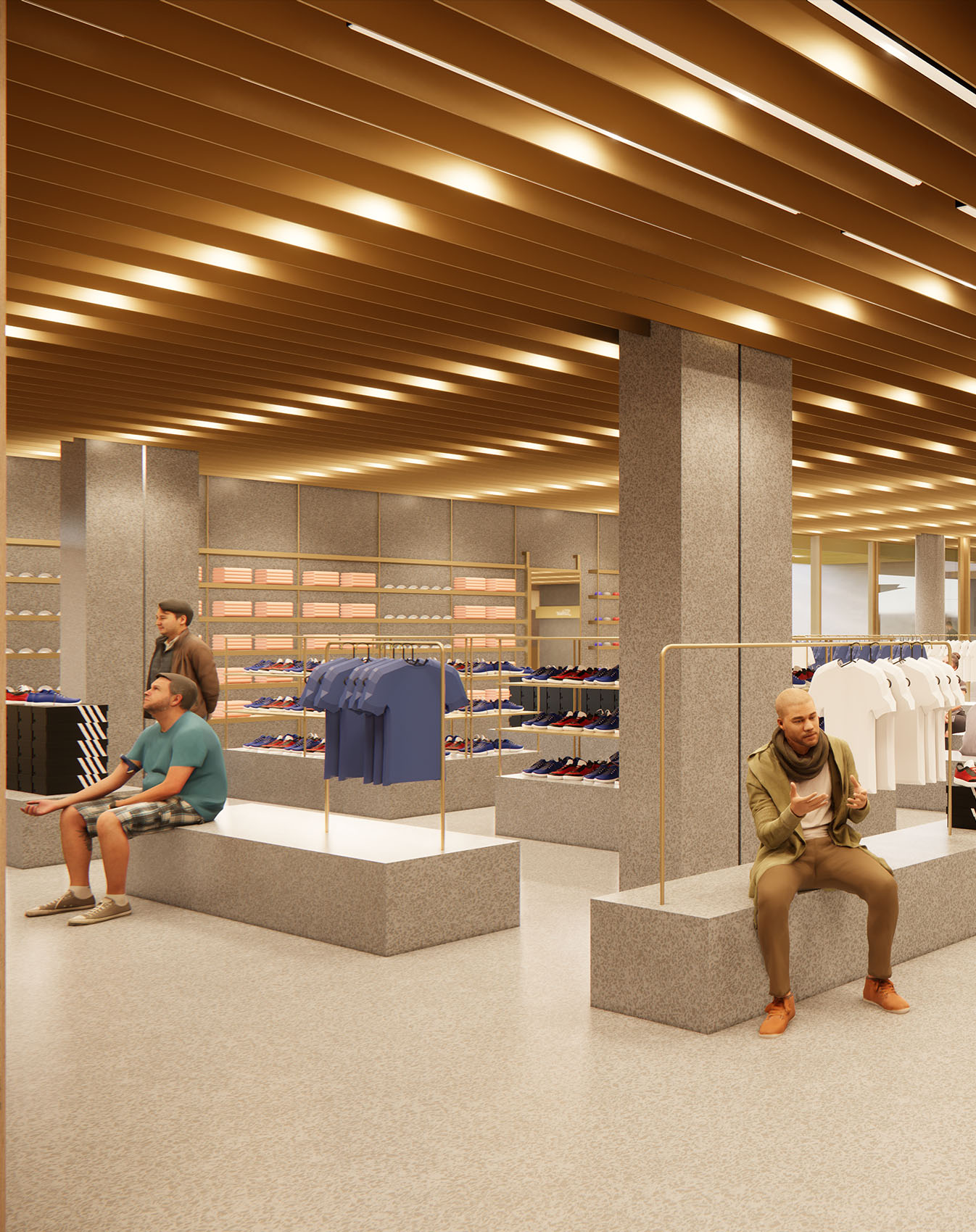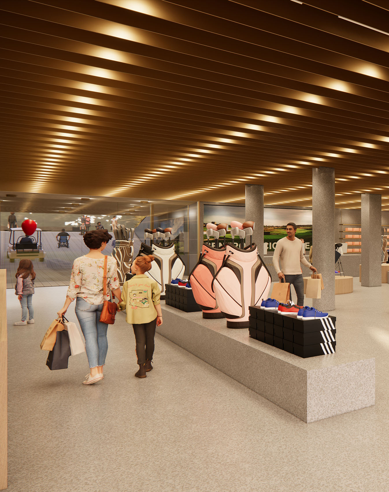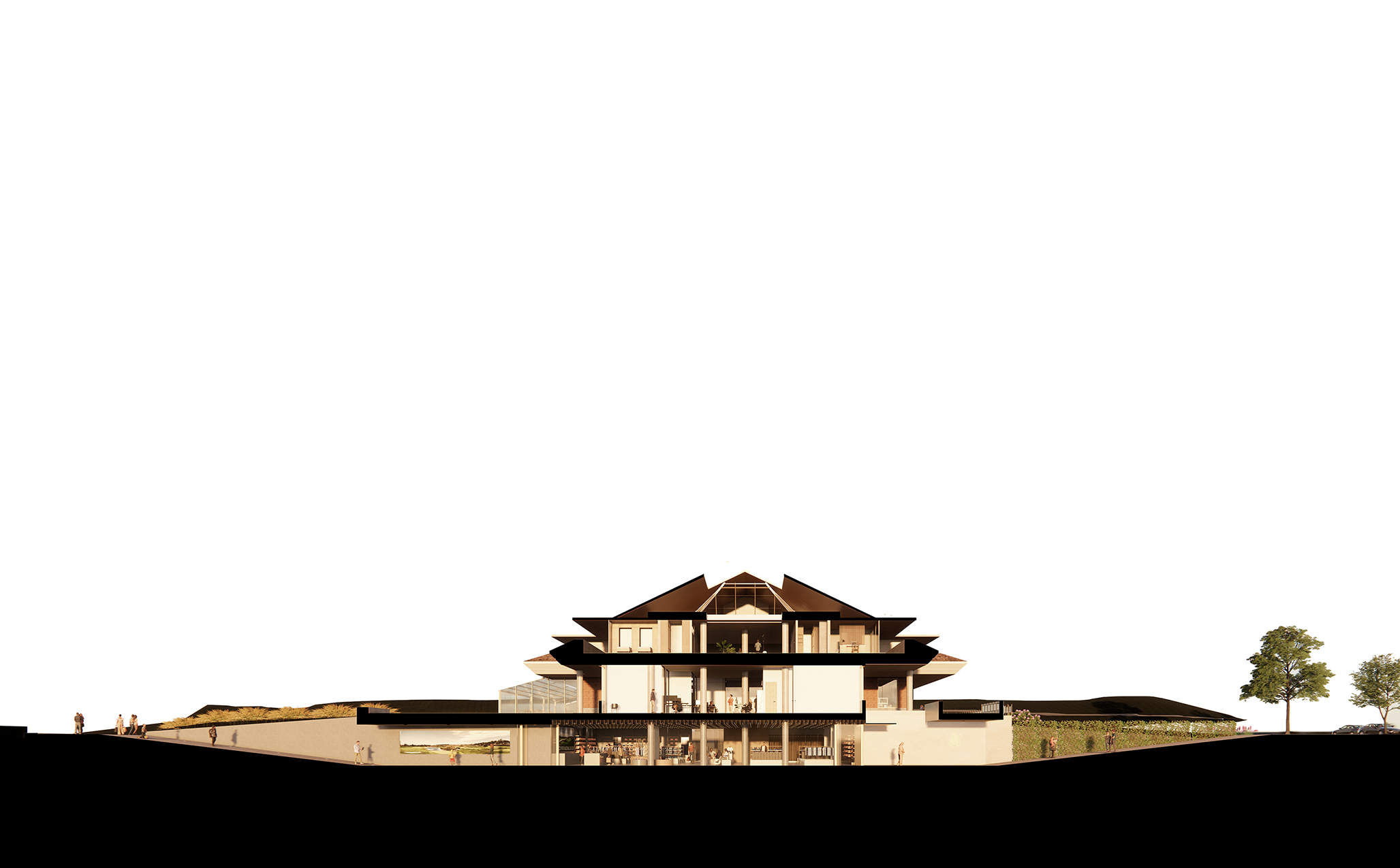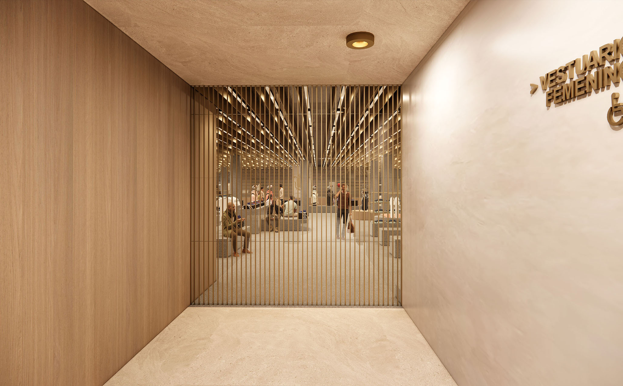 Esta operación permite que, desde el aparcamiento, el visitante pueda atravesar el edificio y salir directamente al hoyo 18, activando así una planta sótano hasta ahora infrautilizada. A partir de esta nueva circulación, se construye en el corazón del edificio una calle interior que articula, por un lado, la tienda —redimensionada y transformada en eje vertebrador de la actividad del campo y del propio edificio— y, por otro, una secuencia de locales comerciales que aportan sentido, vida y programa a este corredor central.