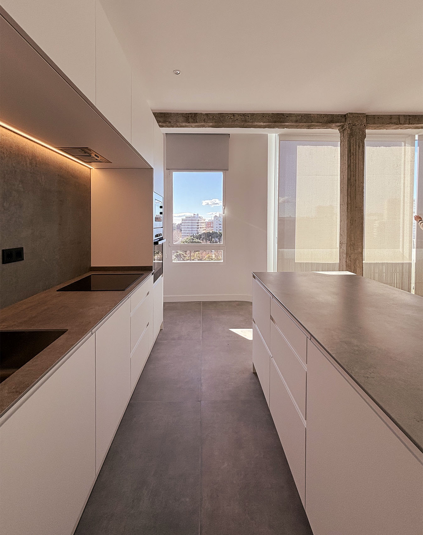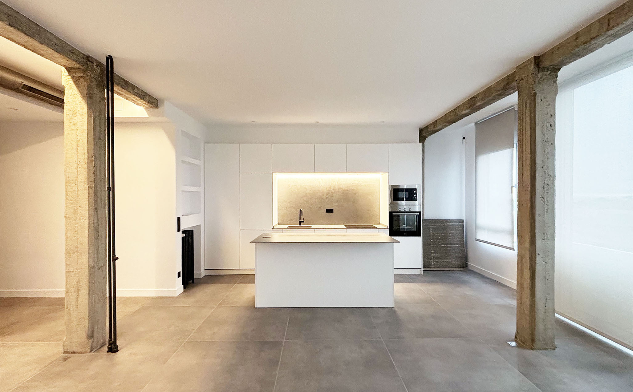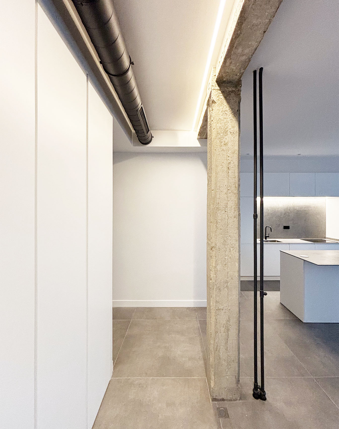 Al avanzar hacia la zona de día, el espacio se abre y se llena de luz natural. La intervención busca aquí la máxima transparencia visual: el hormigón convive con una paleta neutra y con elementos contemporáneos como la isla de cocina, concebida como una pieza ligera que organiza el ambiente sin imponerse. Los conductos vistos y los techos ligeramente retranqueados dejan entrever la infraestructura del edificio, integrándola en la estética del conjunto.