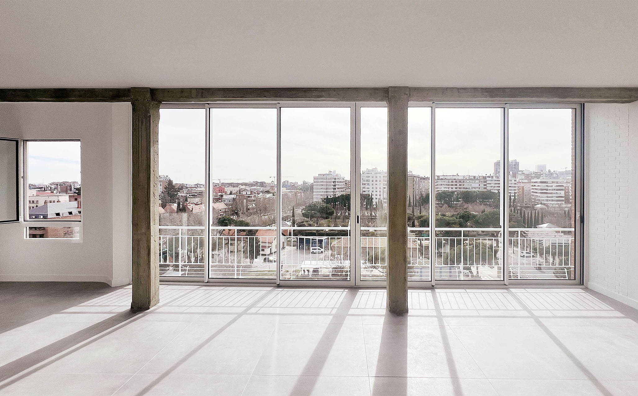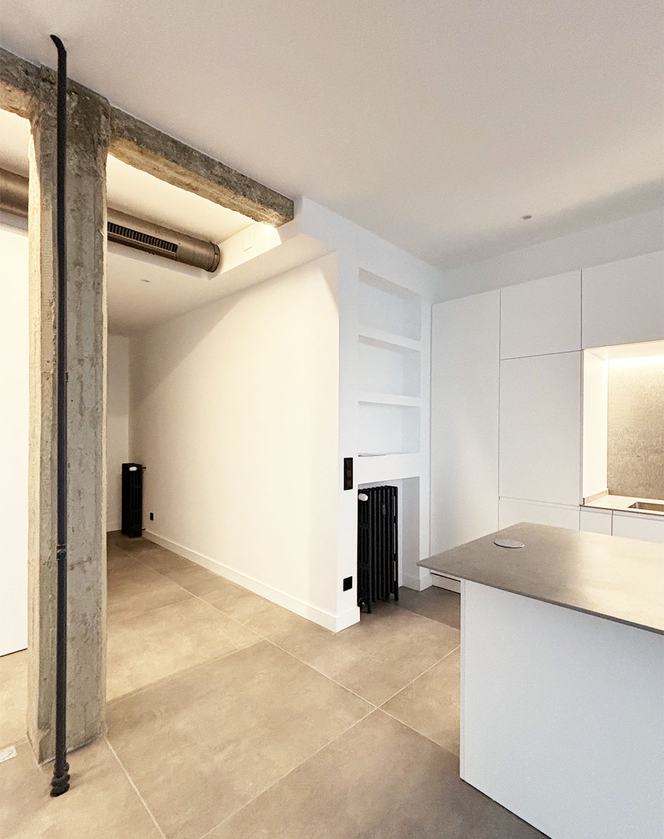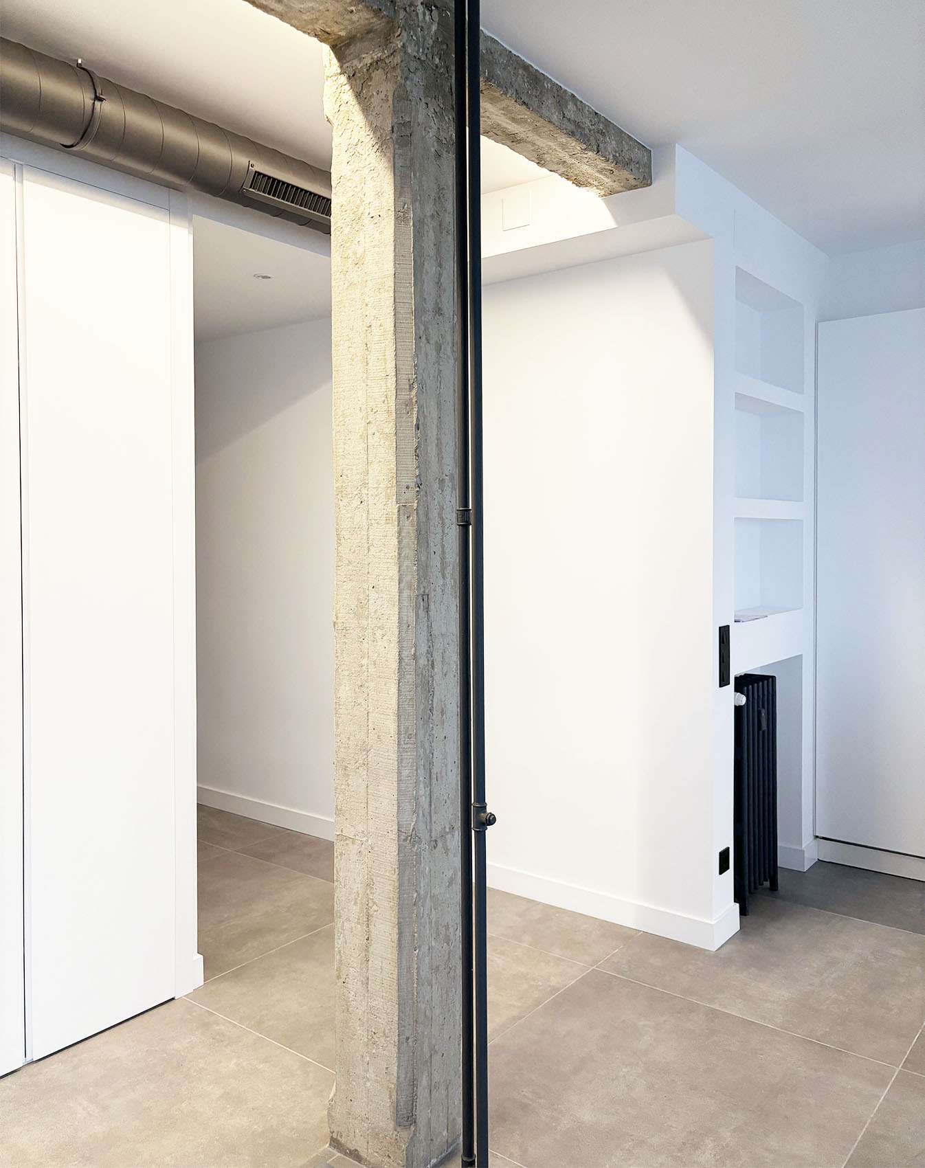 Al avanzar hacia la zona de día, el espacio se abre y se llena de luz natural. La intervención busca aquí la máxima transparencia visual: el hormigón convive con una paleta neutra y con elementos contemporáneos como la isla de cocina, concebida como una pieza ligera que organiza el ambiente sin imponerse. Los conductos vistos y los techos ligeramente retranqueados dejan entrever la infraestructura del edificio, integrándola en la estética del conjunto.