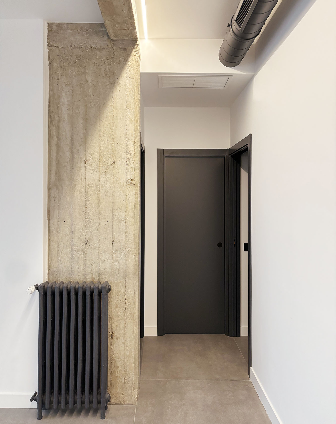 En las zonas de acceso y circulación, los pilares y vigas emergen entre superficies blancas y carpinterías oscuras, creando un contraste suave pero intencionado. La luz, cuidadosamente dirigida, resalta la verticalidad de la estructura y acompaña al usuario hacia las estancias principales. El pavimento continuo y las líneas limpias de las puertas aportan una sensación de orden y serenidad, reforzando la claridad del recorrido.