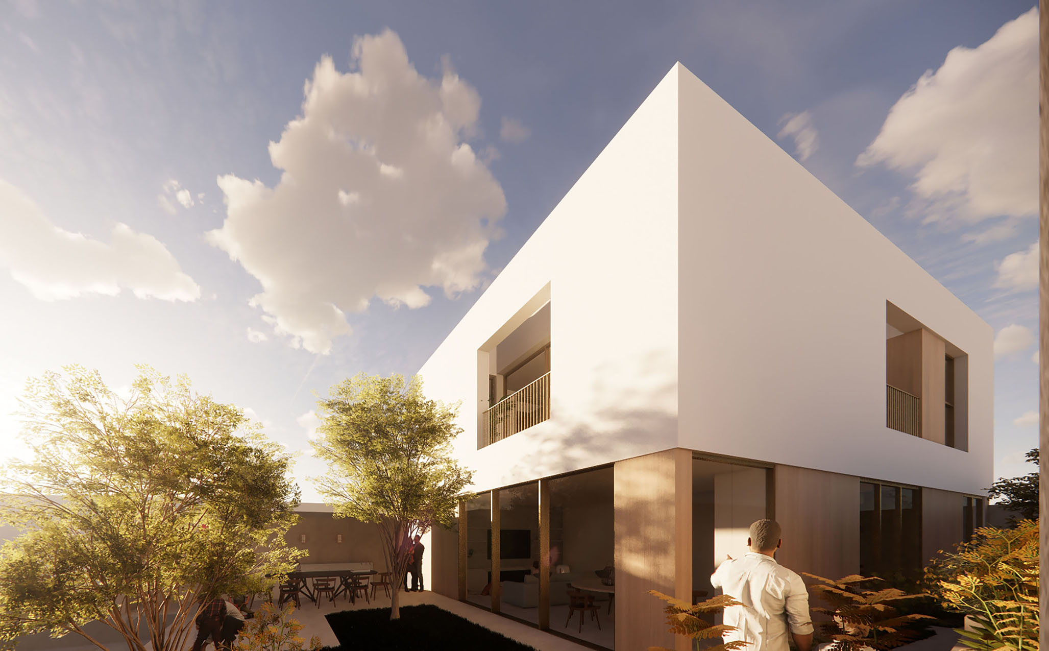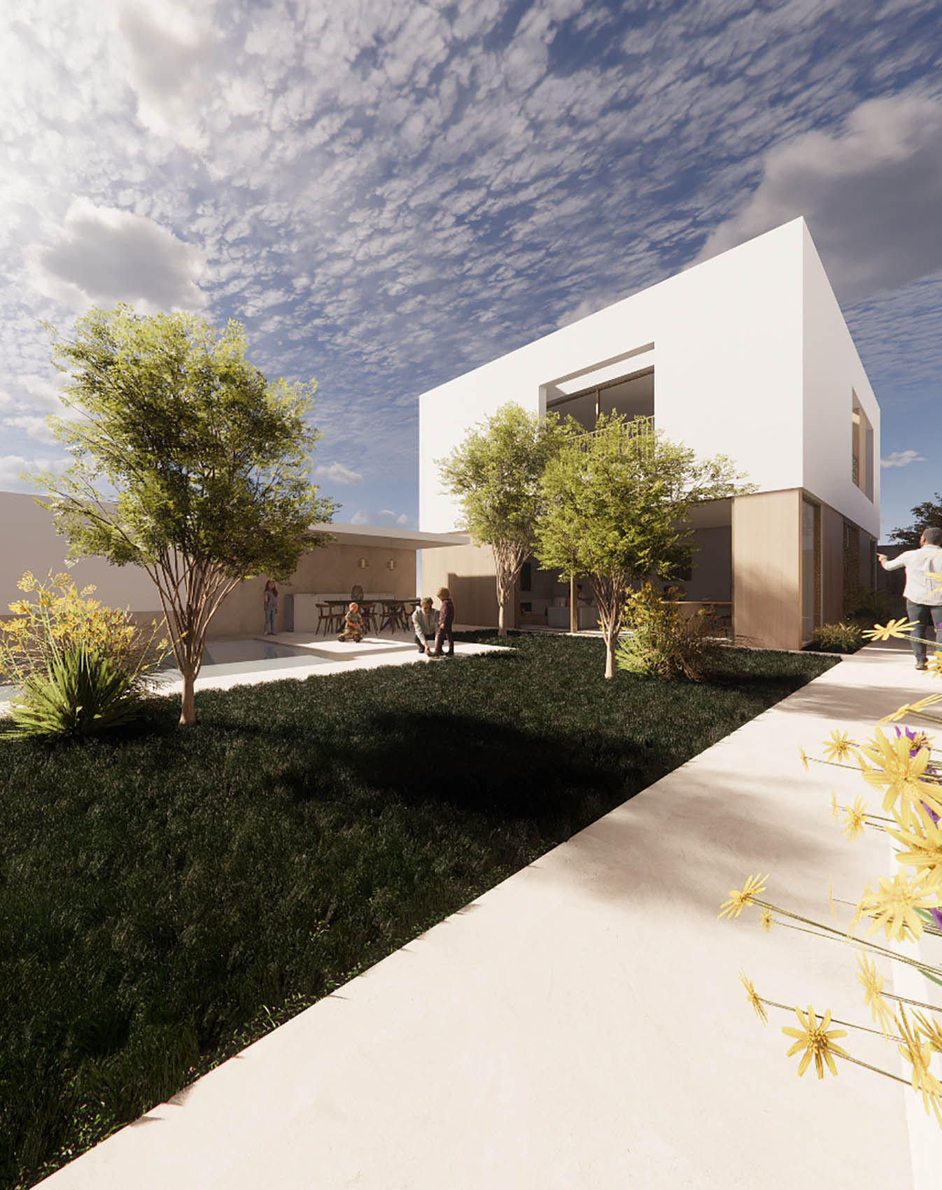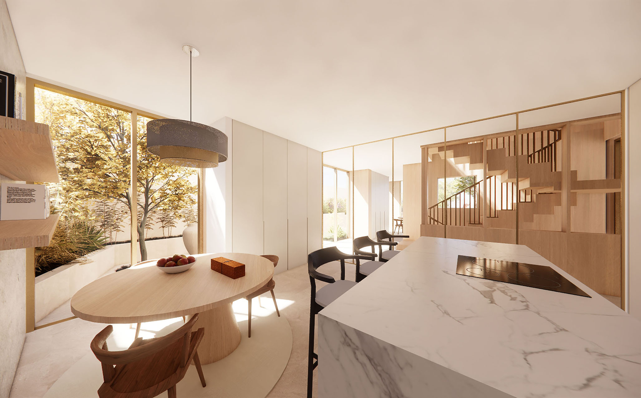 La vida cotidiana se despliega entre la cocina vinculada al retranqueo y el salón abierto al jardín, mientras que en la planta superior la caja blanca aloja los dormitorios y el estudio, enmarcados por grandes huecos y terrazas. En el sótano, una escalera independiente conduce a un programa más privado, conectado al exterior por medio de una calle interior. Así, la vivienda construye nuevas formas de relación entre luz, estructura y paisaje.