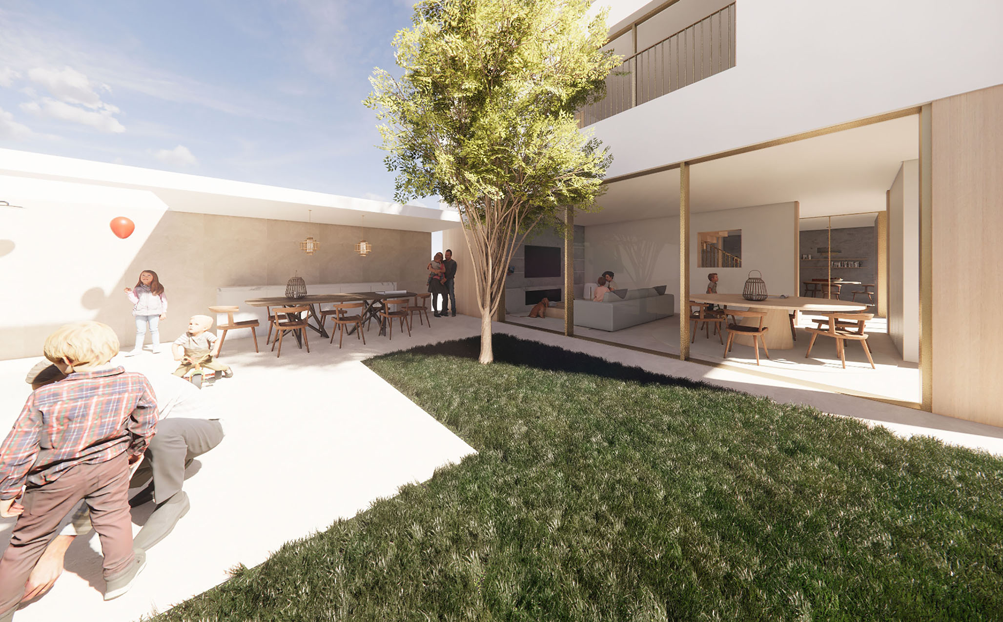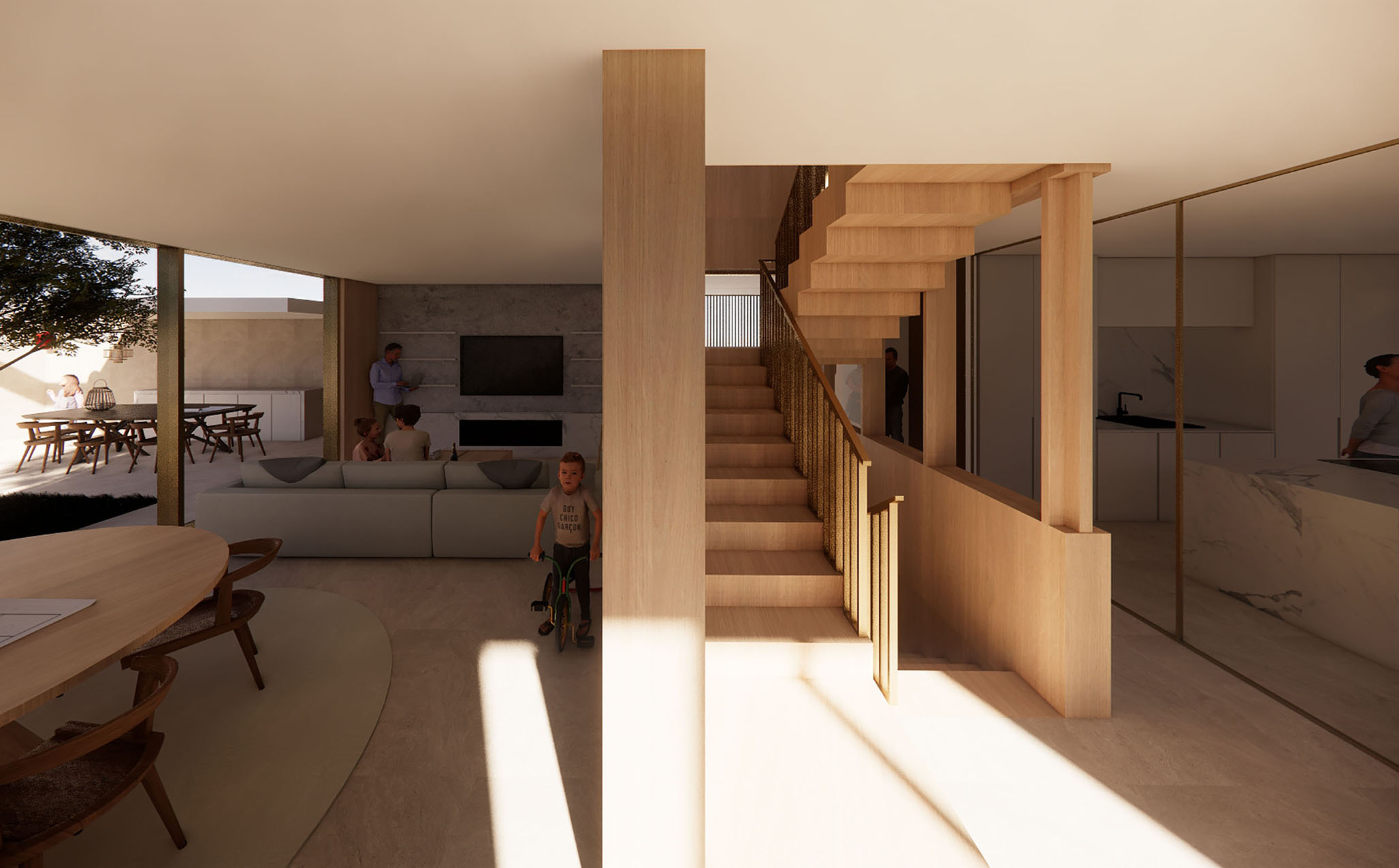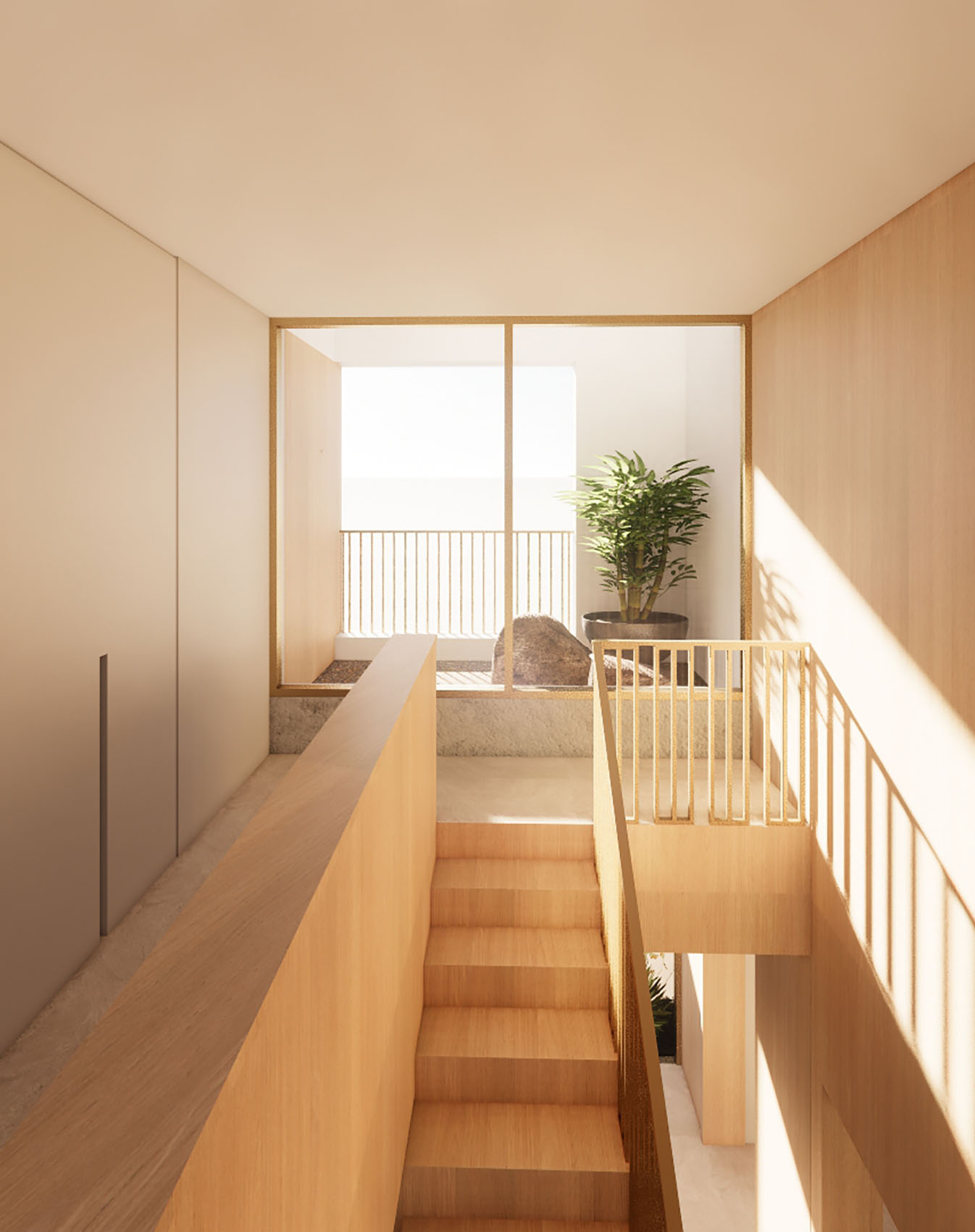 Una vivienda binuclear, en el que la escalera se configura en el medio del espacio, asociándose a ella un patio vertical que permite desdibujar los límites de la parcela en su dirección norte-sur.