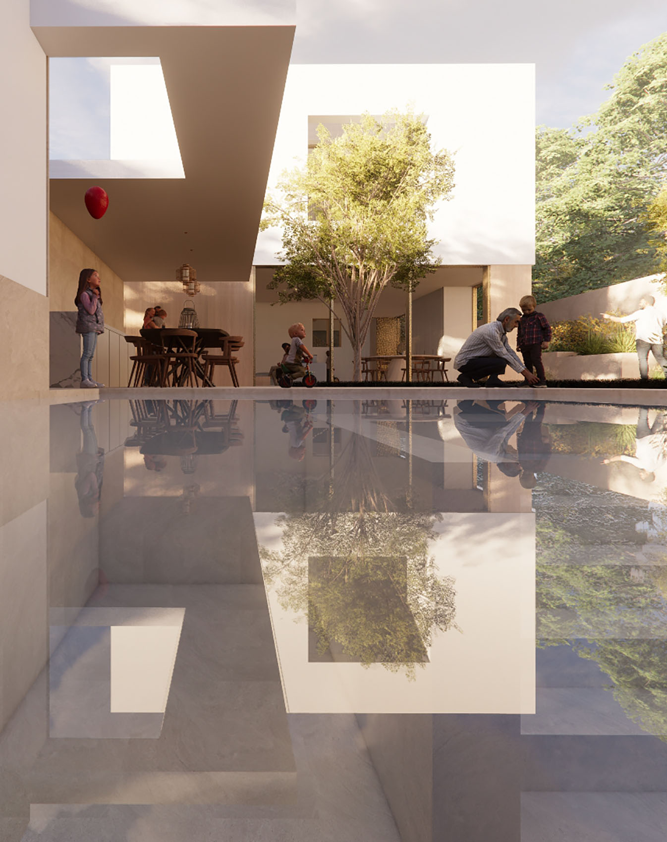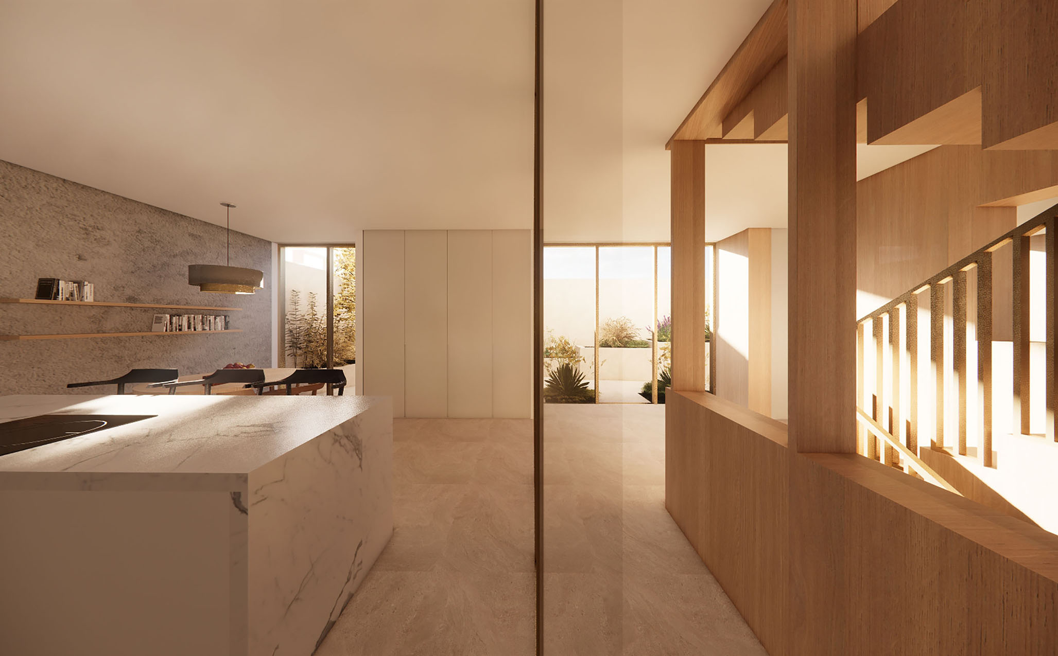 La caja de vidrio actúa como pieza mediadora, articulando la llegada a la vivienda a través de un paisaje previo que integra la piscina y activa el retranqueo como umbral. En su interior, la escalera —acompañada por un patio vertical— organiza la casa en torno a un eje central que diluye los límites norte-sur.