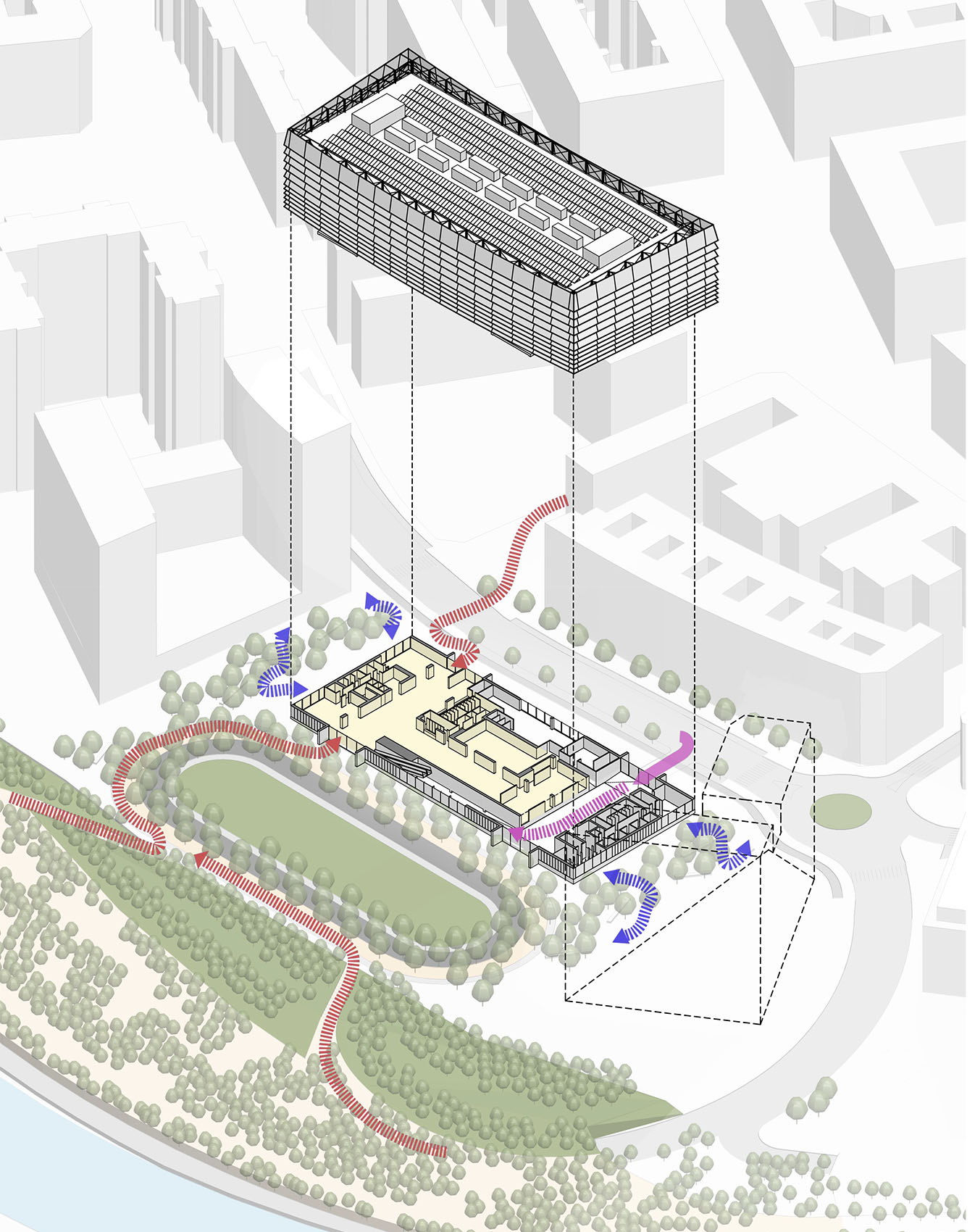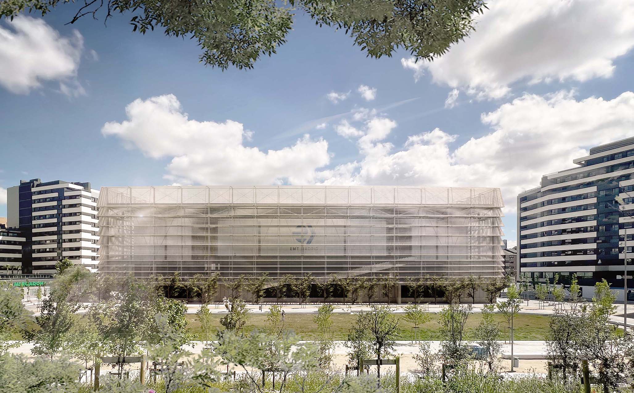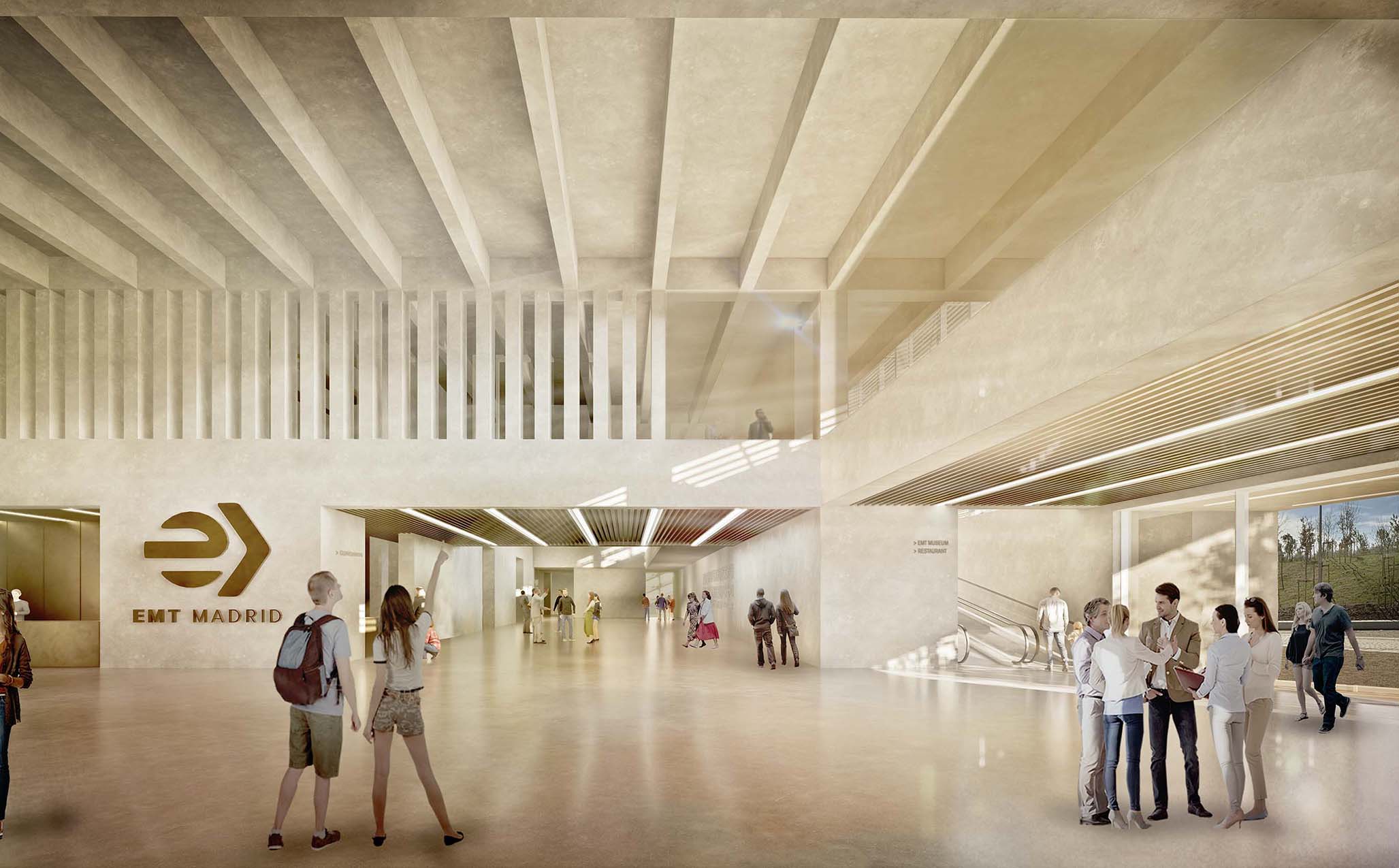 El nuevo Museo de la EMT se concibe como una bisagra urbana que enlaza la ciudad con el parque lineal de Madrid Río. Elevado y permeable en todas sus orientaciones, el edificio abre su presencia hacia el gran eje peatonal y verde del Manzanares, invitando a un tránsito continuo entre arquitectura y paisaje.