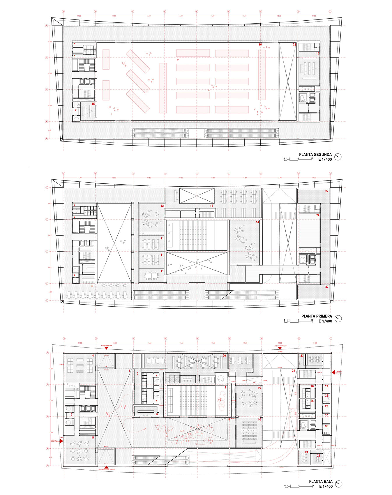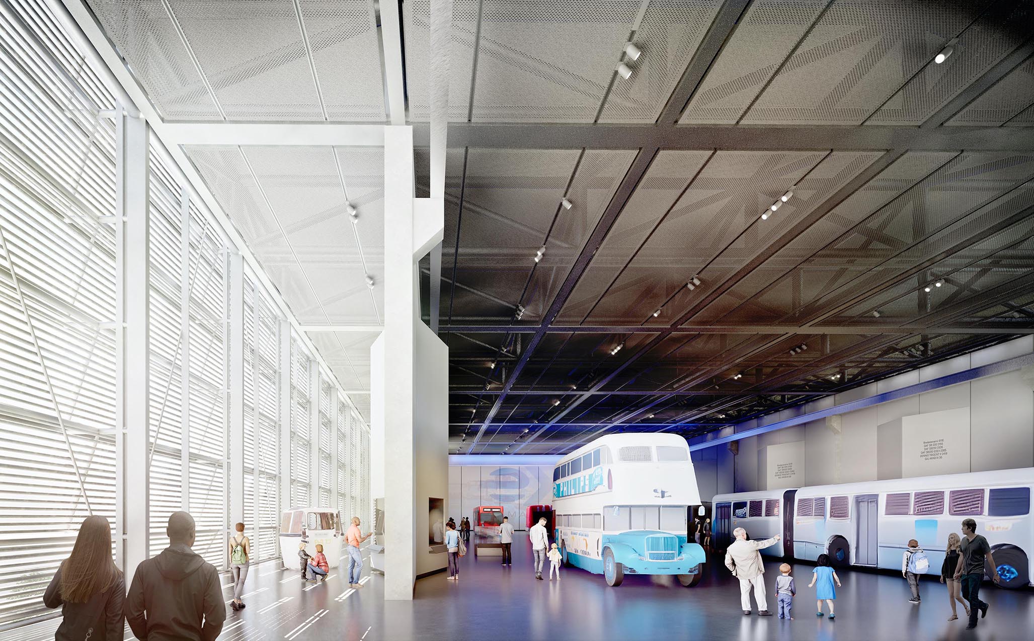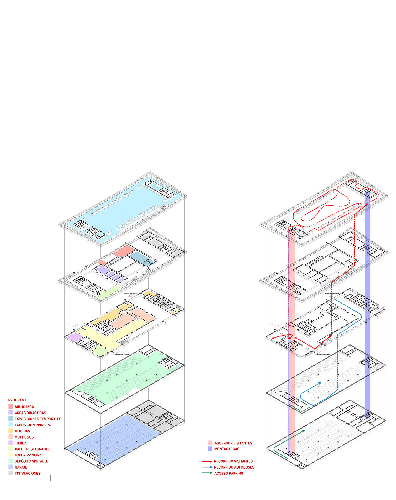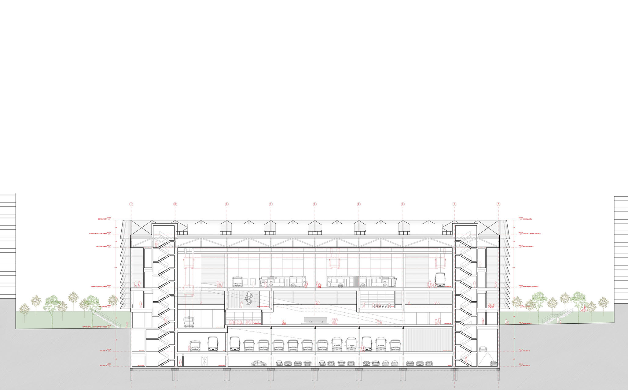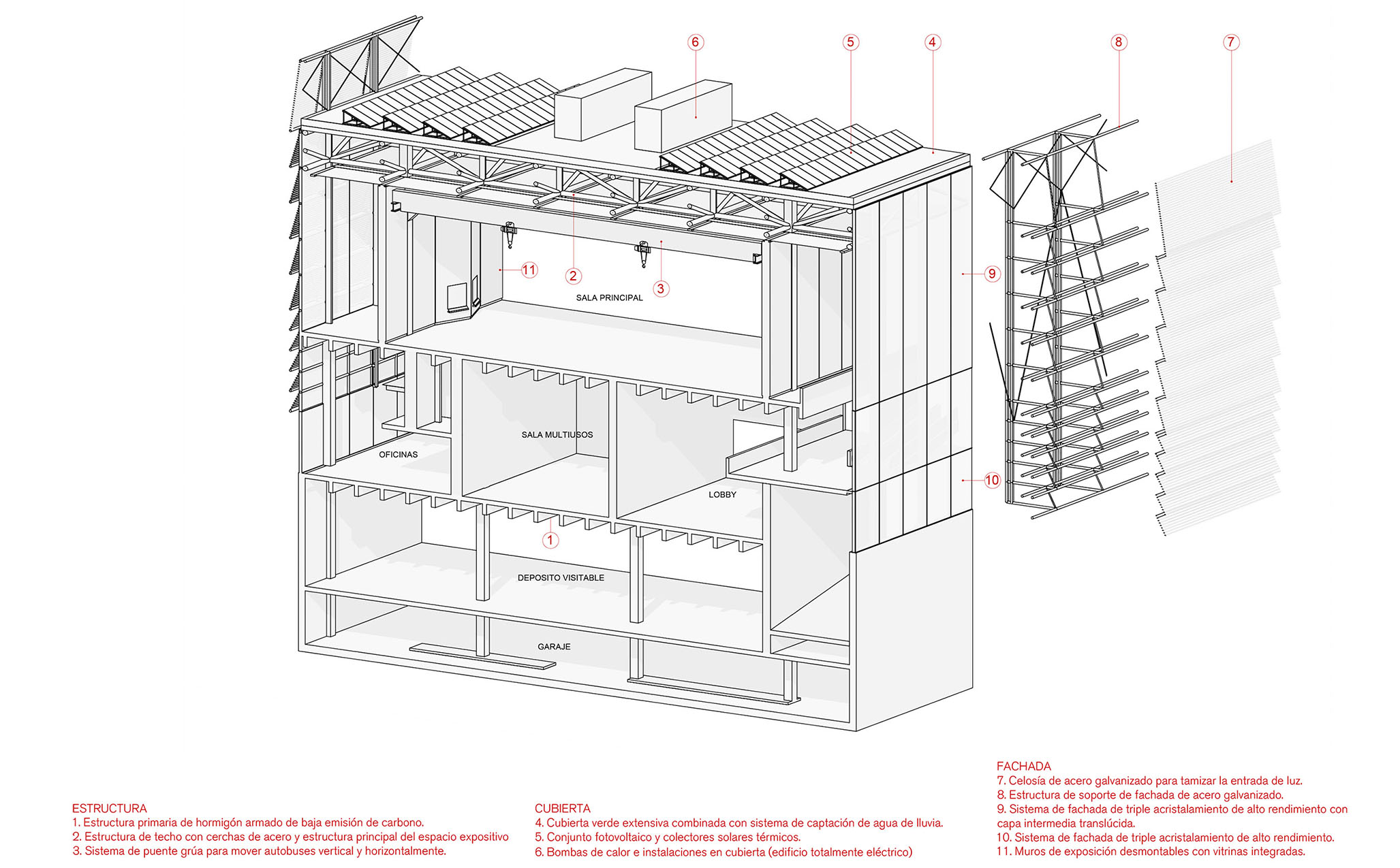 La pieza se organiza mediante dos circulaciones diferenciadas: la peatonal, que asciende desde el noreste a través de un corredor suave y accesible, y la del autobús, que accede desde el sureste, atraviesa el museo y desciende hacia un depósito visitable. Ambos recorridos —uno en ascenso, otro en descenso— confluyen en la sala principal, donde una caja oscura se inserta en el perímetro del edificio y activa un espacio intermedio que responde a la fachada y al paisaje. Allí, el relato expositivo encuentra su anclaje: una arquitectura que, como todo transporte en superficie, avanza en constante diálogo con el territorio que la acompaña.