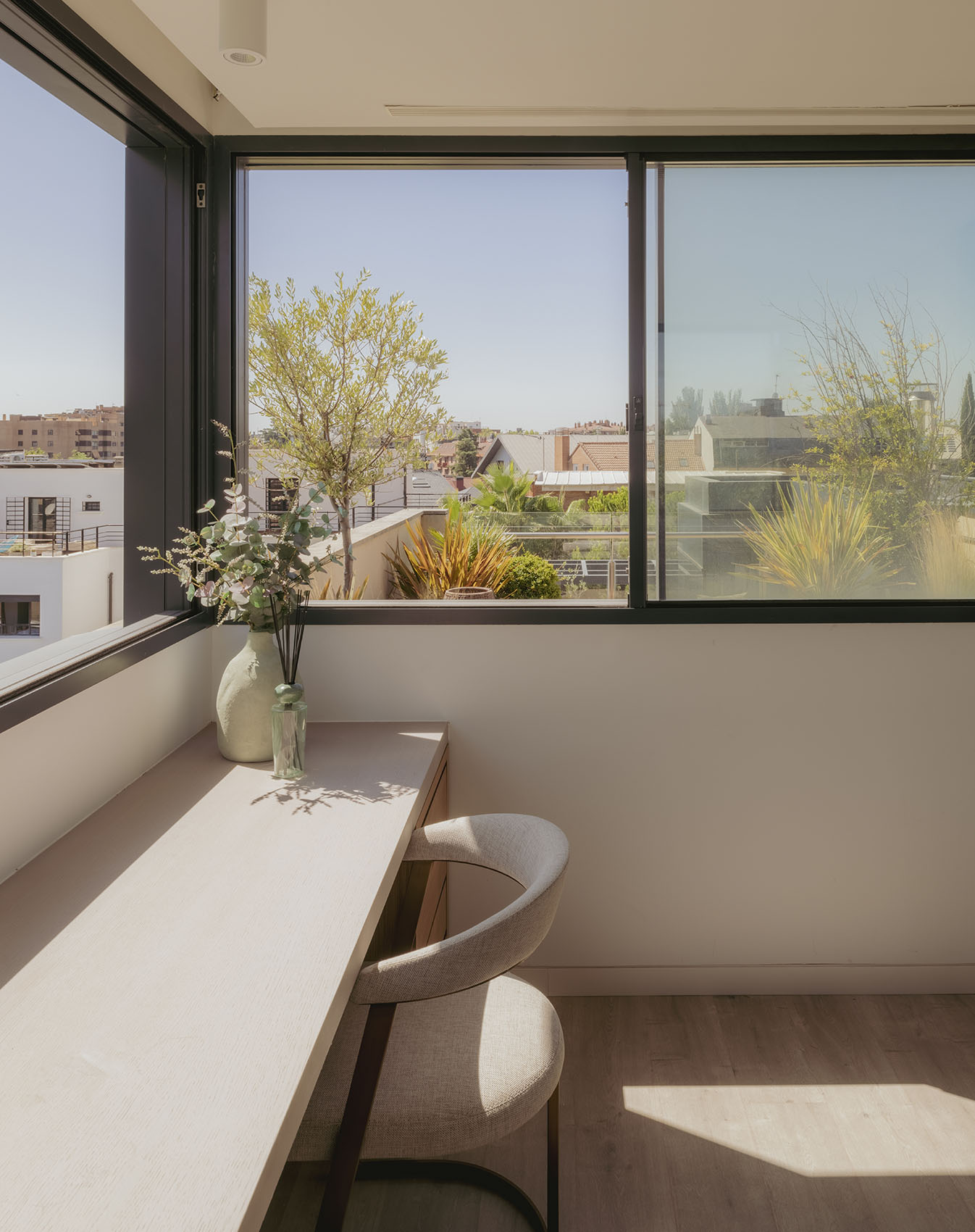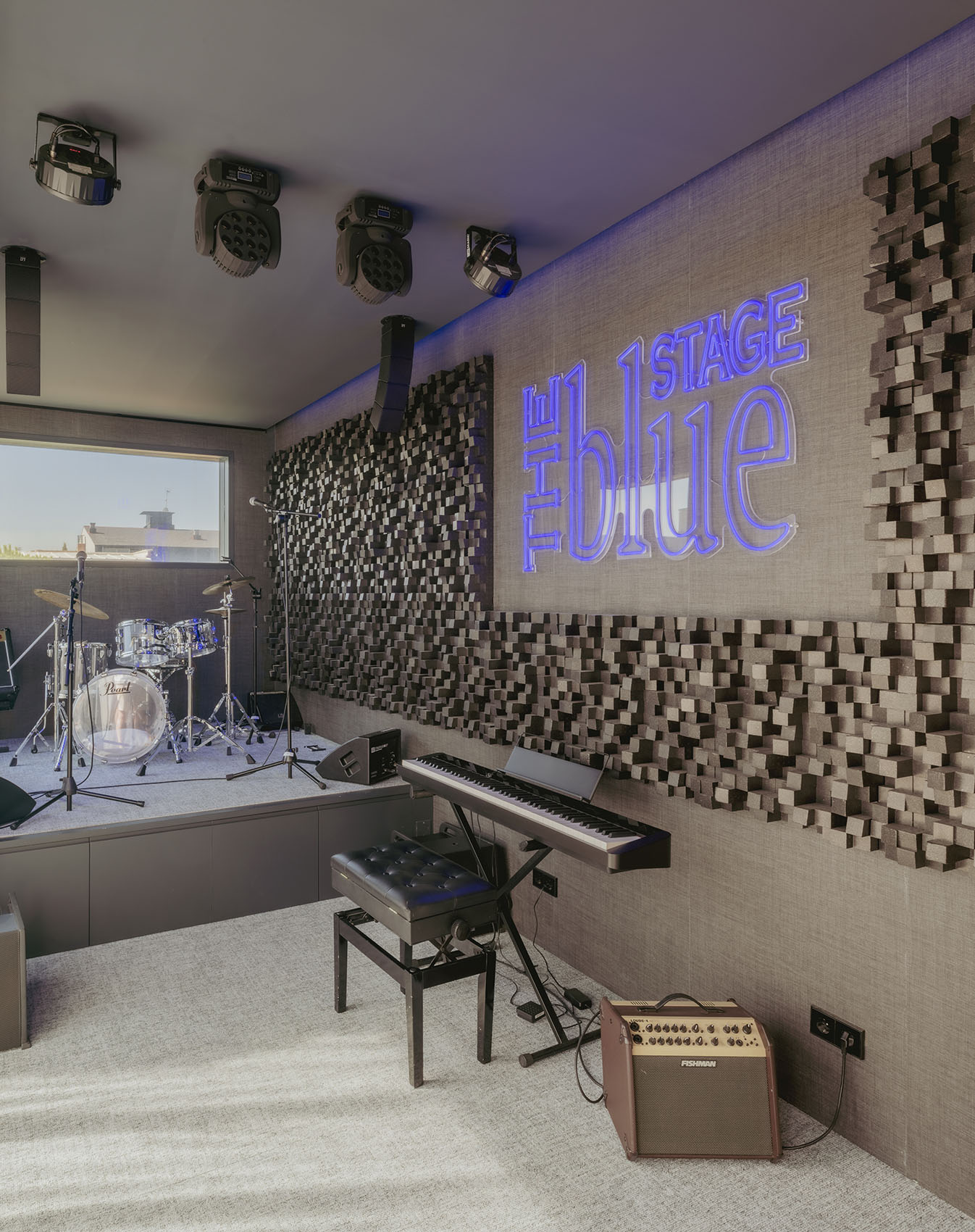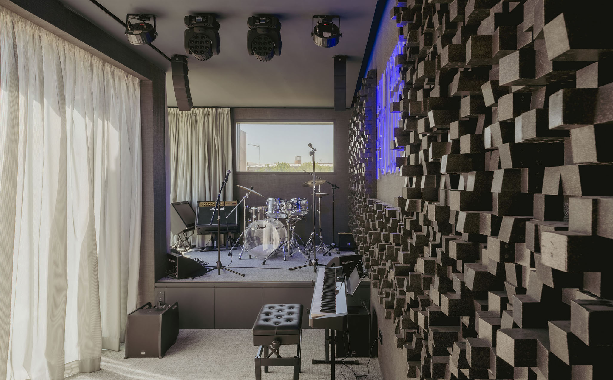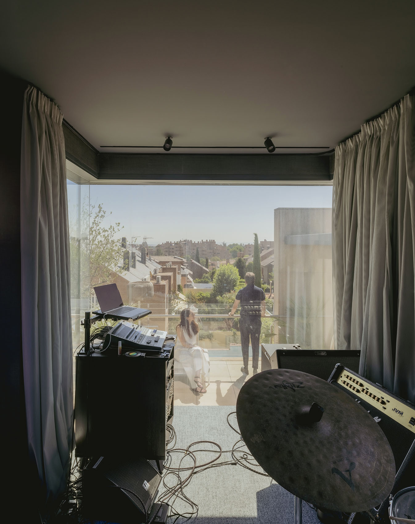 La fachada de vidrio abre la sala al paisaje, fusionando música y horizonte. Un escenario ligeramente sobreelevado define este pequeño escenario doméstico, donde los encuentros con amigos se convierten en rituales de creación y ensueño, suspendidos frente a la vasta horizontalidad de Madrid.