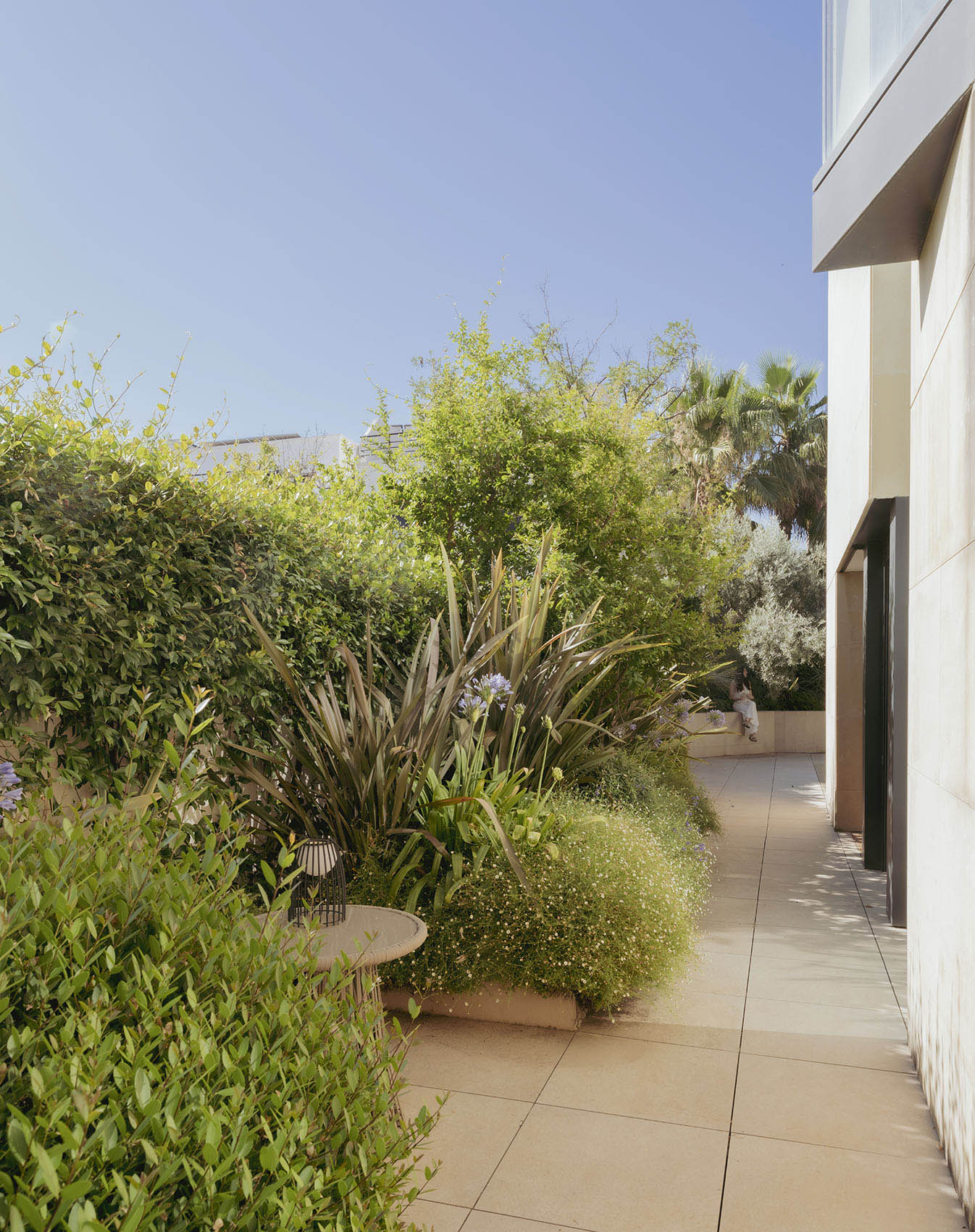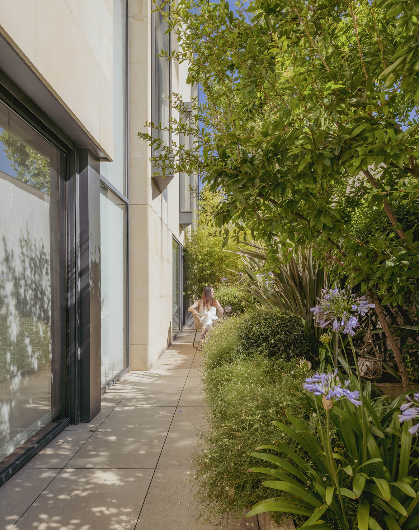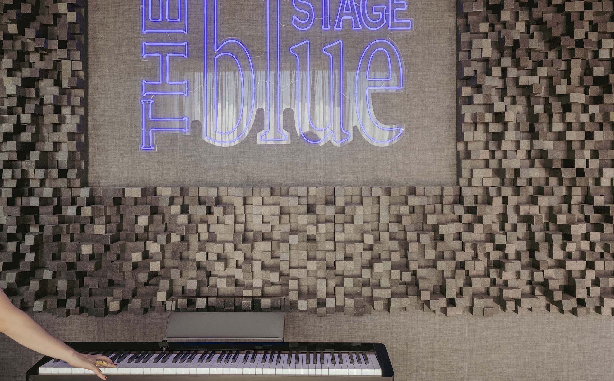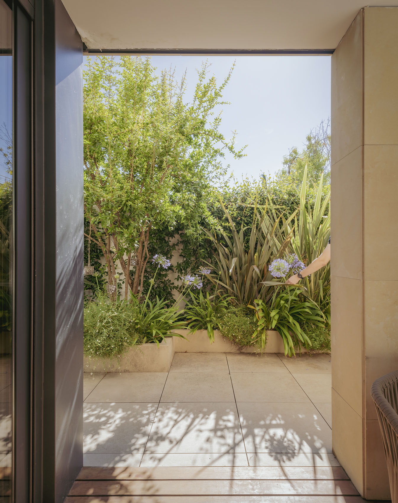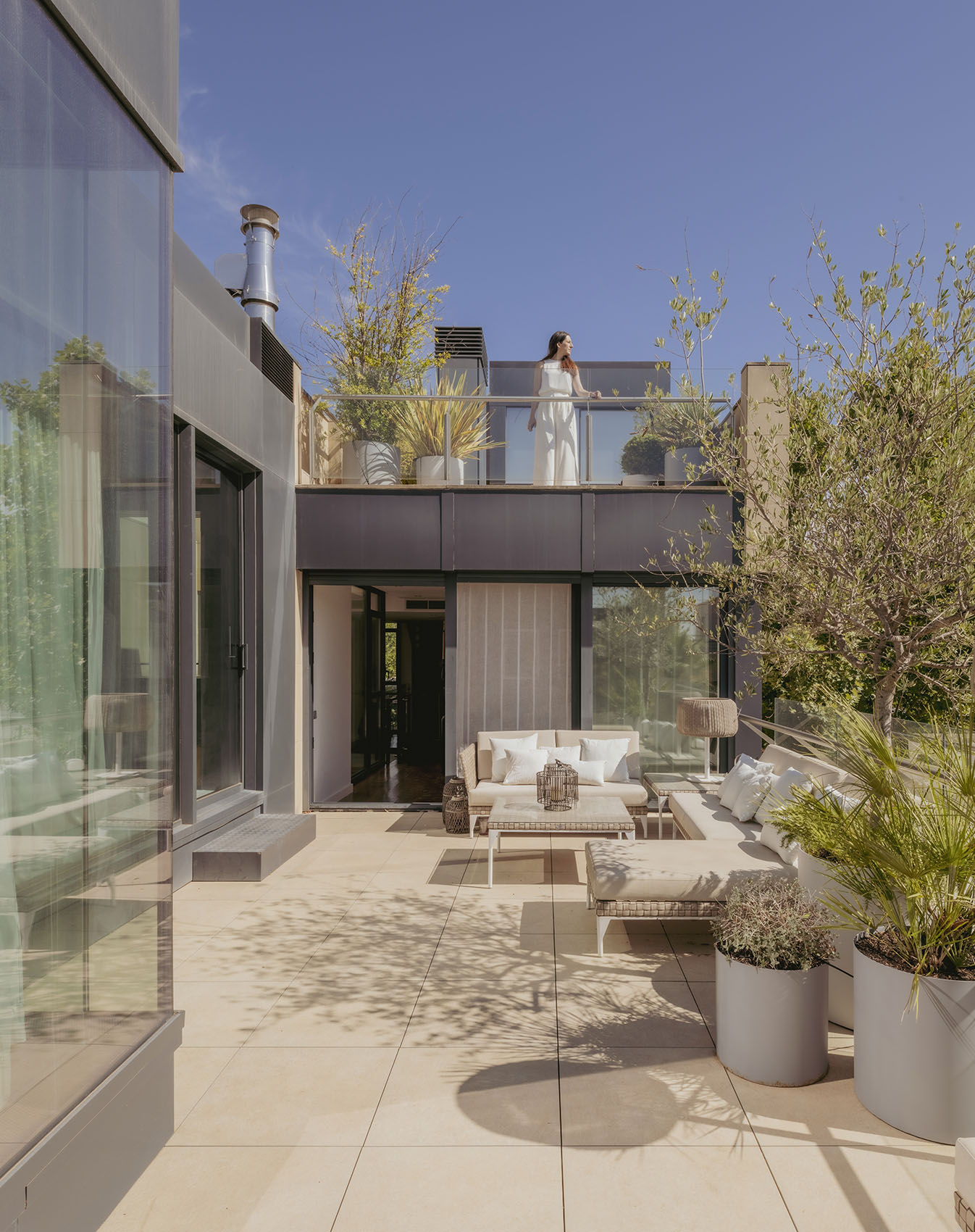 La fachada de vidrio abre la sala al paisaje, fusionando música y horizonte. Un escenario ligeramente sobreelevado define este pequeño escenario doméstico, donde los encuentros con amigos se convierten en rituales de creación y ensueño, suspendidos frente a la vasta horizontalidad de Madrid.
