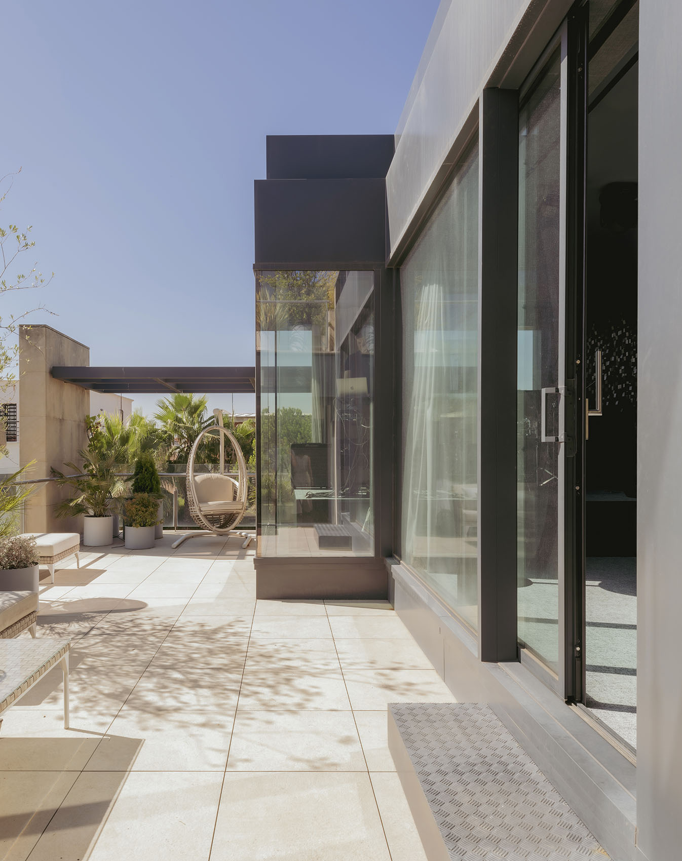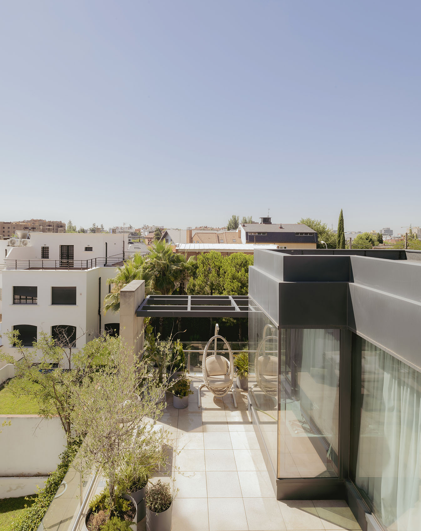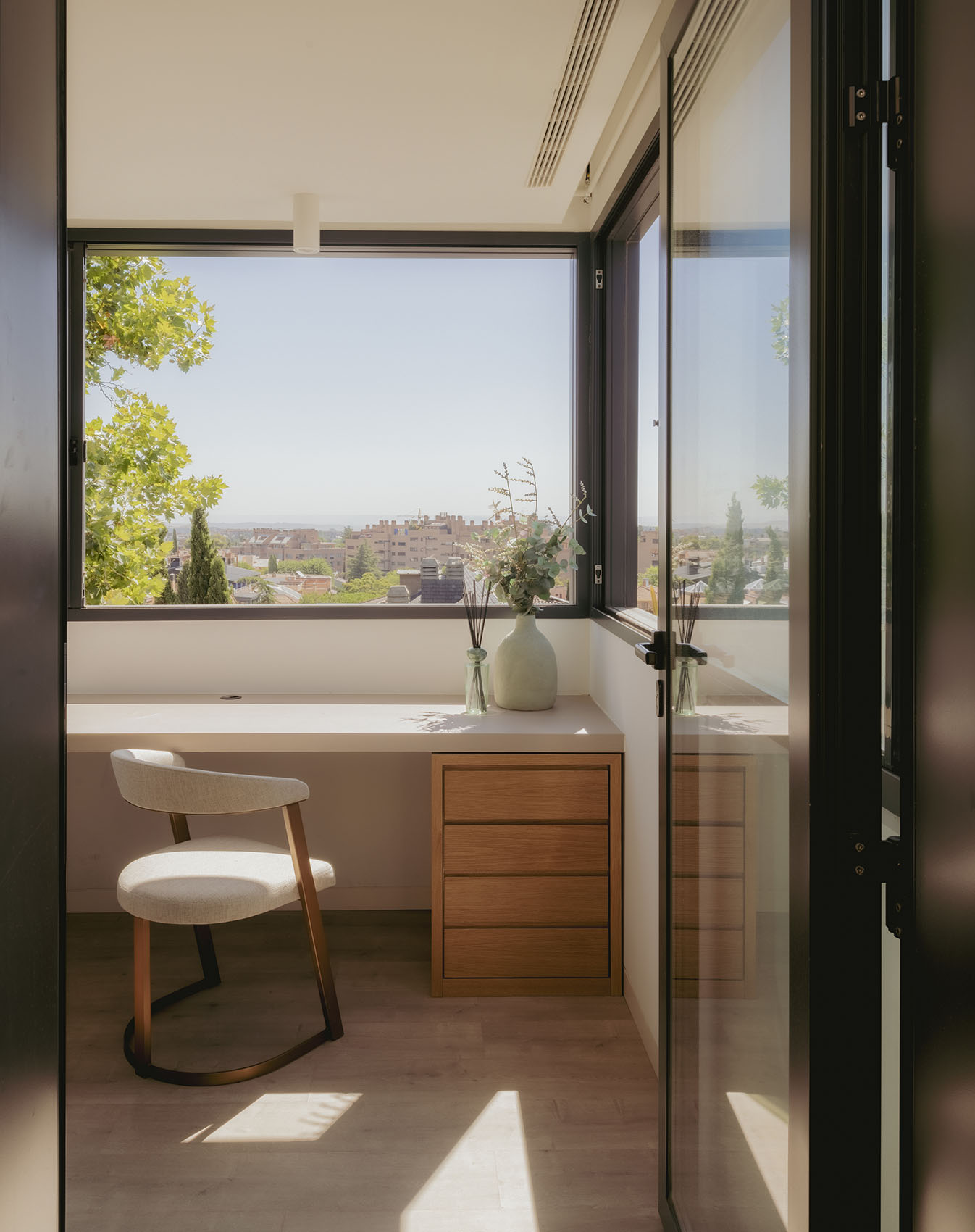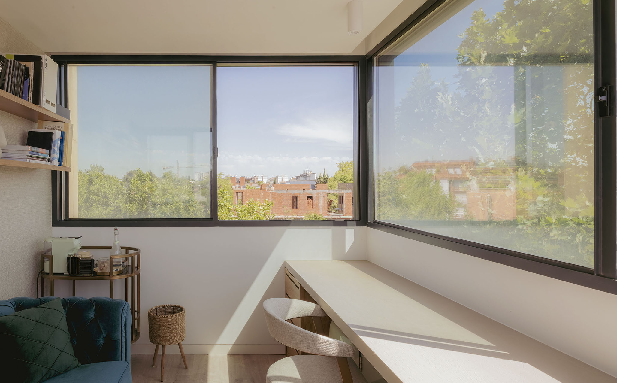 En el entorno de Arturo Soria, sobre una vivienda unifamiliar existente, se propone una delicada ampliación que alberga una pequeña sala de música familiar: un espacio donde la música se convierte en lenguaje y vínculo entre quienes habitan la casa. La intervención transforma una terraza abierta y olvidada en un lugar vivo y habitable, donde el vidrio define los límites y a la vez dialoga con el horizonte lejano de Madrid.